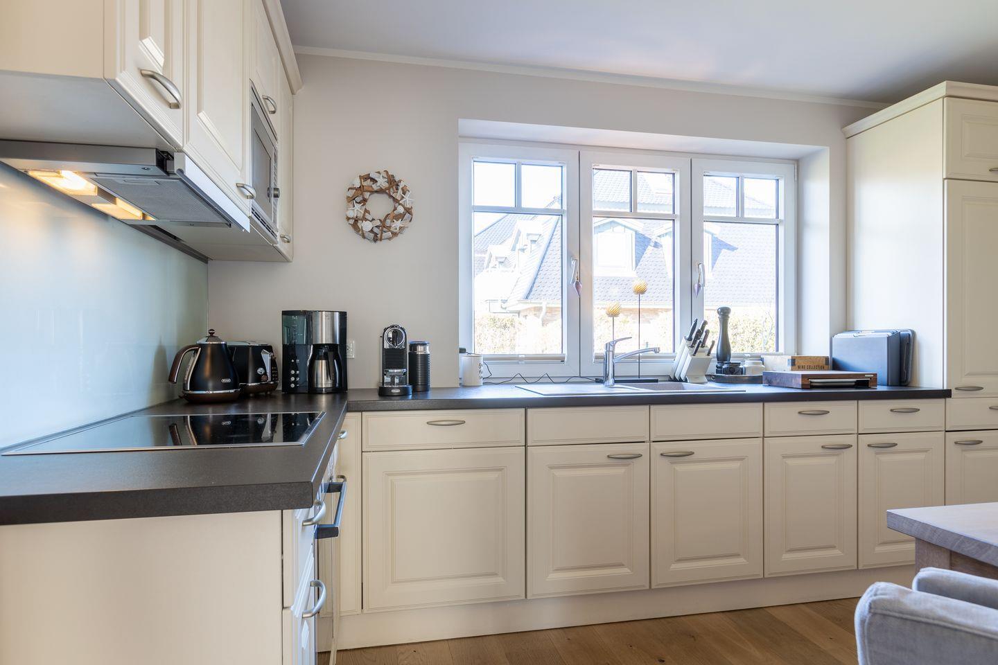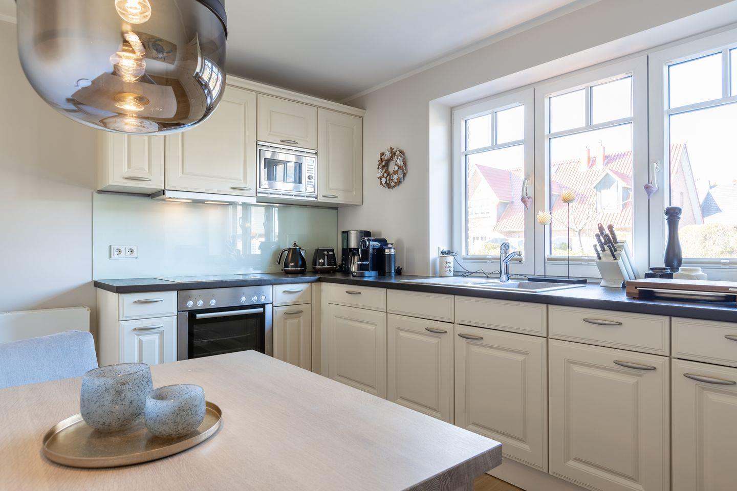 Die separate Küche ist komplett ausgestattet und bietet neben einem Cerankochfeld, Geschirrspüler und Nespresso-Maschine auch eine gemütliche Sitzecke für ein entspanntes Frühstück oder Abendessen.
