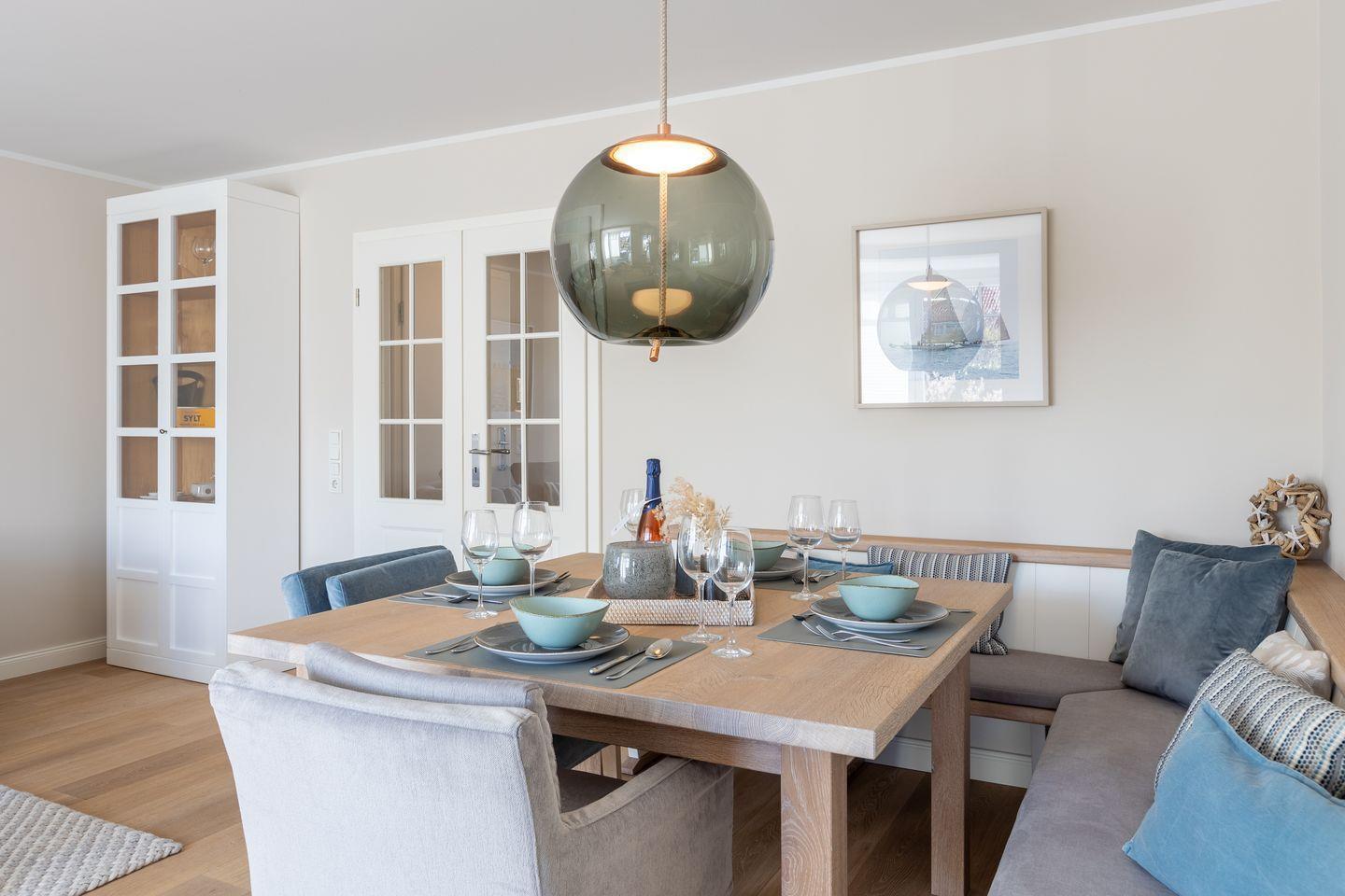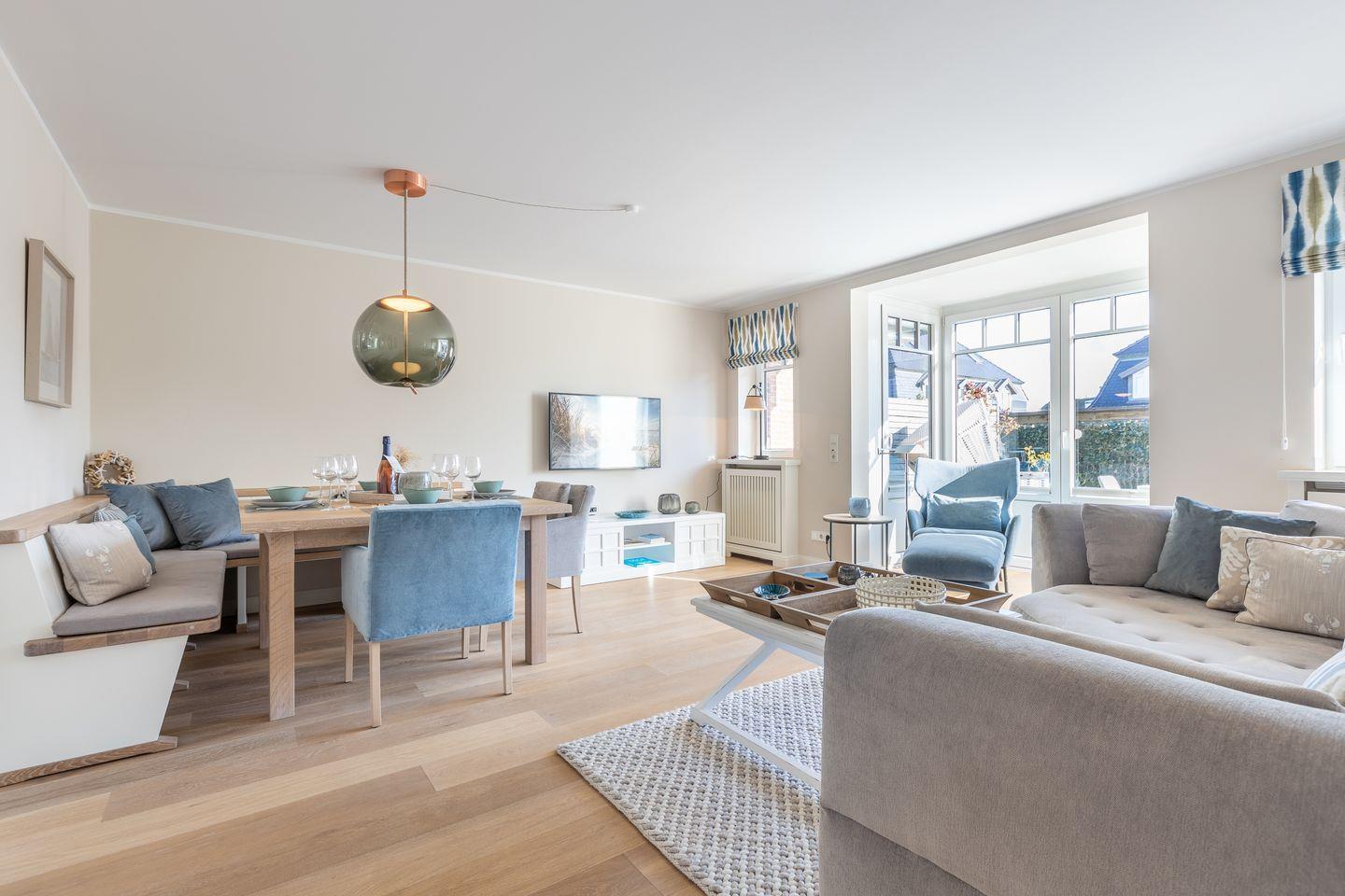 Das großzügige Wohnzimmer ist mit einem gemütlichen Sofa, einem Esstisch und TV ausgestattet. Der Erker in Südausrichtung sorgt für viel Licht und ein angenehmes Wohnambiente. Von hier gelangen Sie direkt zur möblierten Süd-Terrasse und dem kleinen Gartenbereich mit einem windgeschützten Westerländer Strandkorb (verfügbar von Frühjahr bis Herbst).