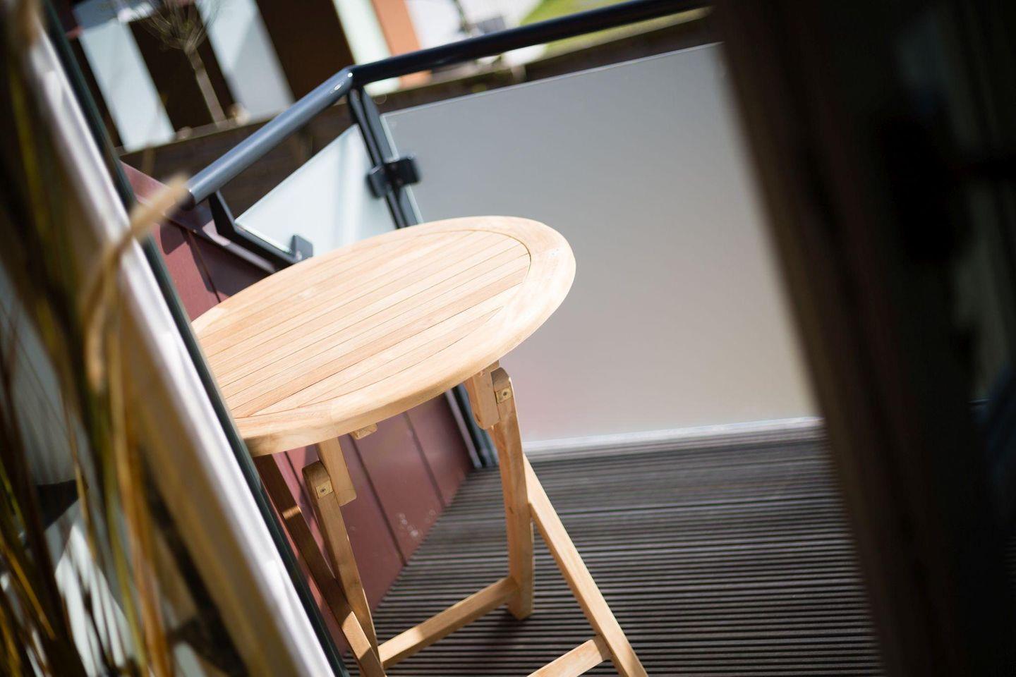 Der helle Wohnbereich ist geschmackvoll eingerichtet und lädt mit einer bequemen Couch, zwei Sesseln und einem TV zum Entspannen ein. Der Essbereich bietet Platz für vier Personen und der direkte Zugang zum möblierten Balkon nach Süden verspricht sonnige Stunden und entspannte Abende.