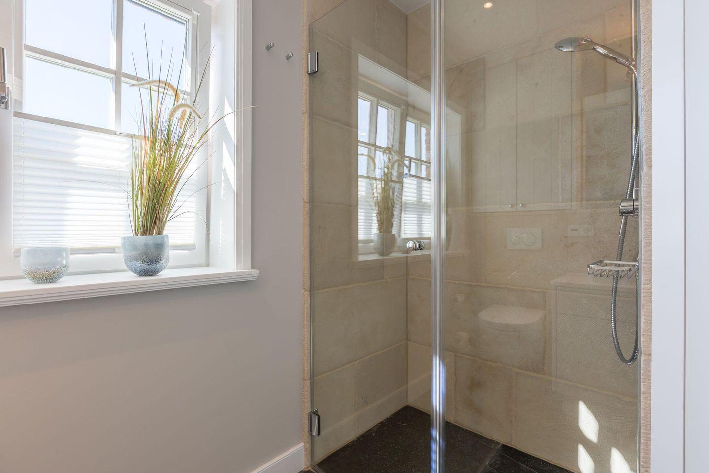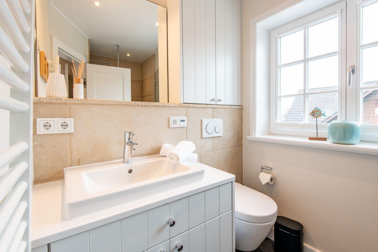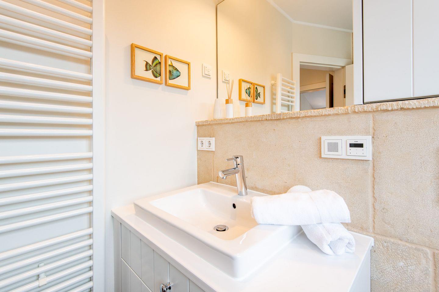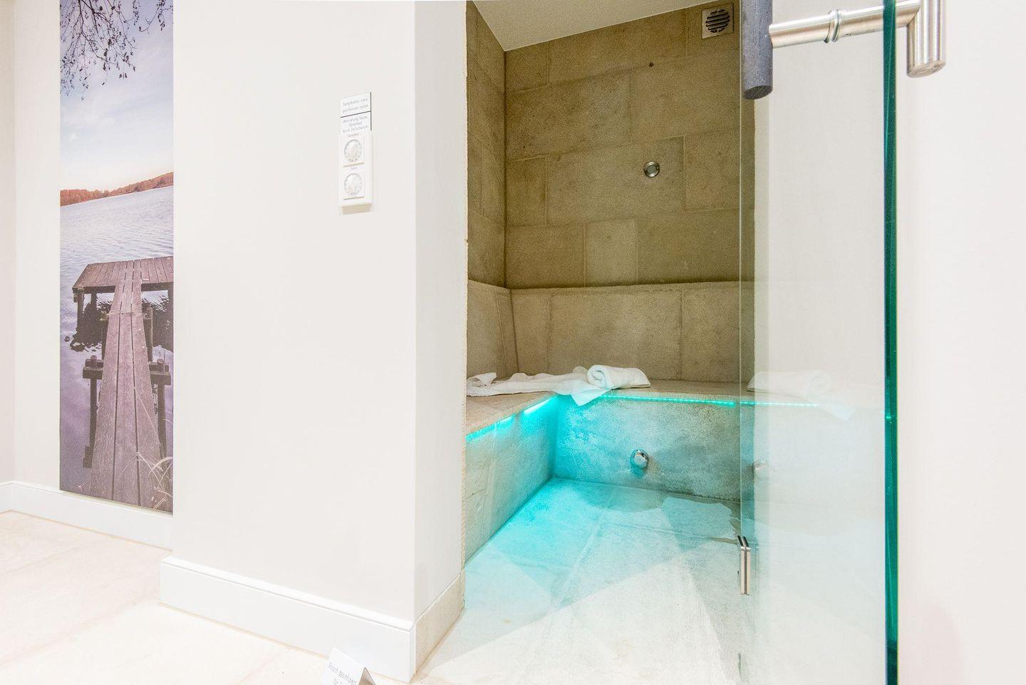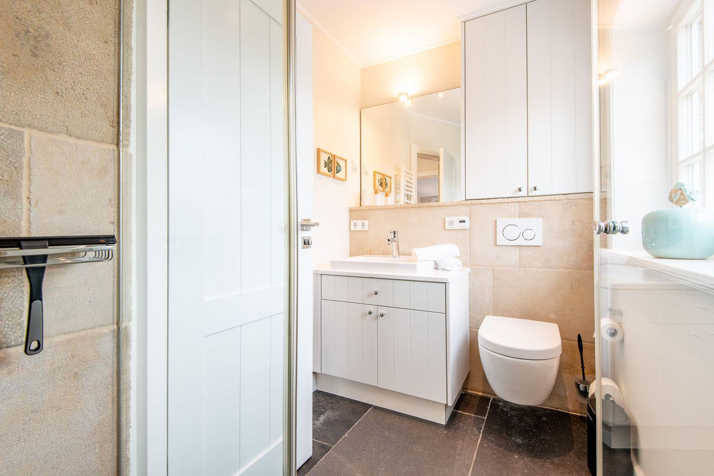 Das moderne Badezimmer überzeugt mit einer ebenerdigen Dusche, WC, Handtuchwärmer, Föhn und Tageslicht. Der gemeinschaftliche Wellnessbereich des Hauses bietet eine Sauna, ein Dampfbad und eine erfrischende Schwalldusche – perfekt für entspannende Stunden nach einem Tag am Strand.