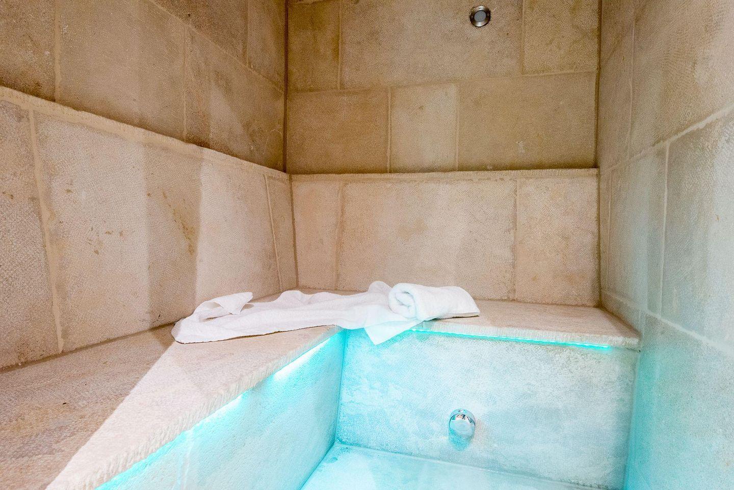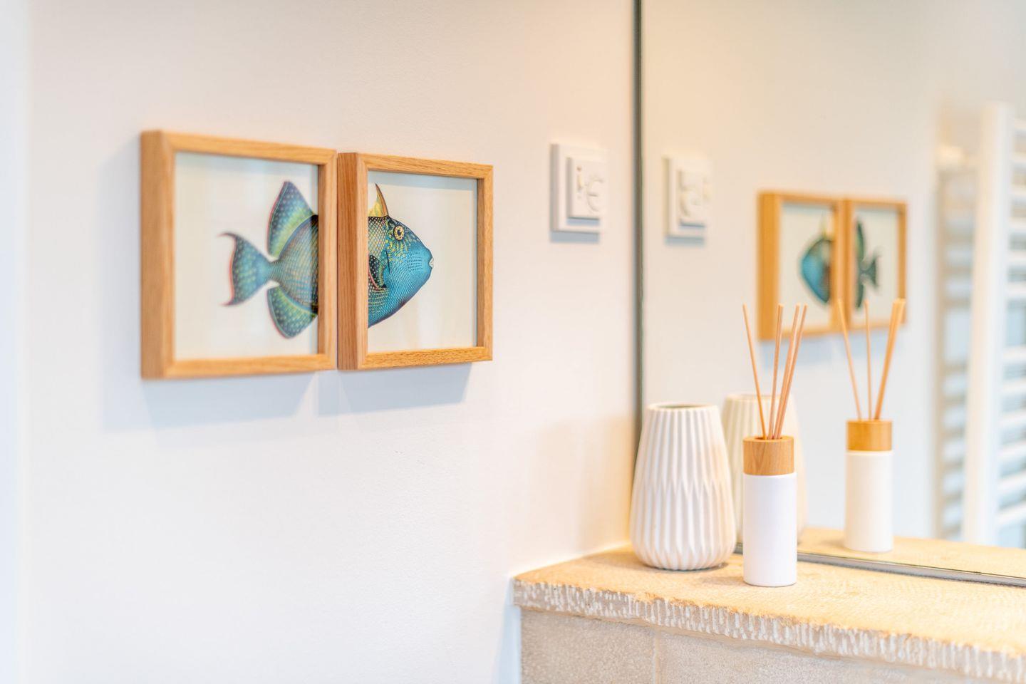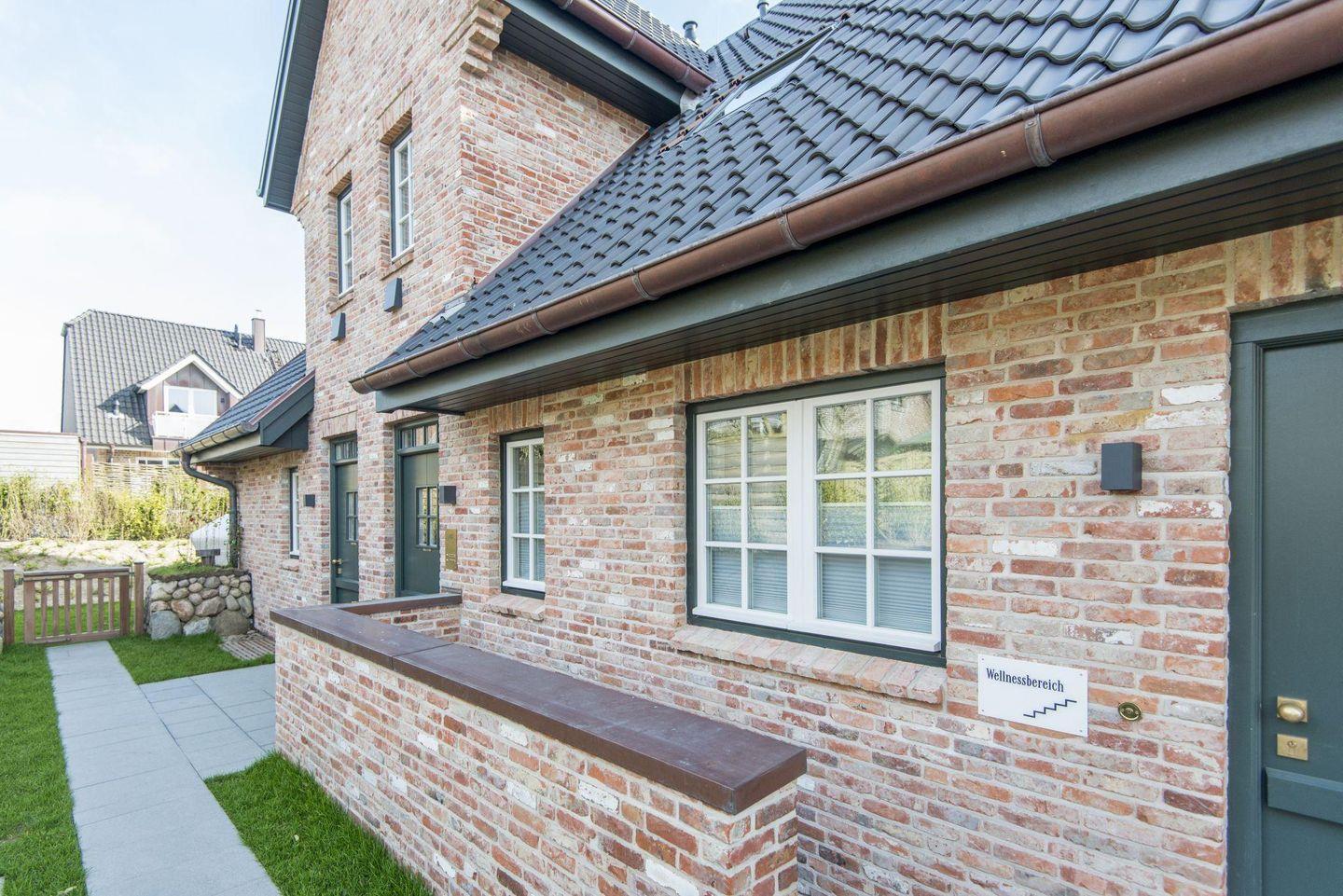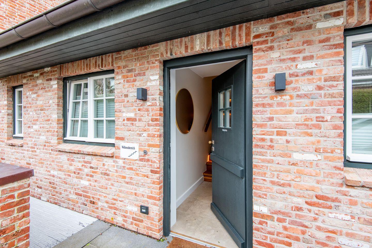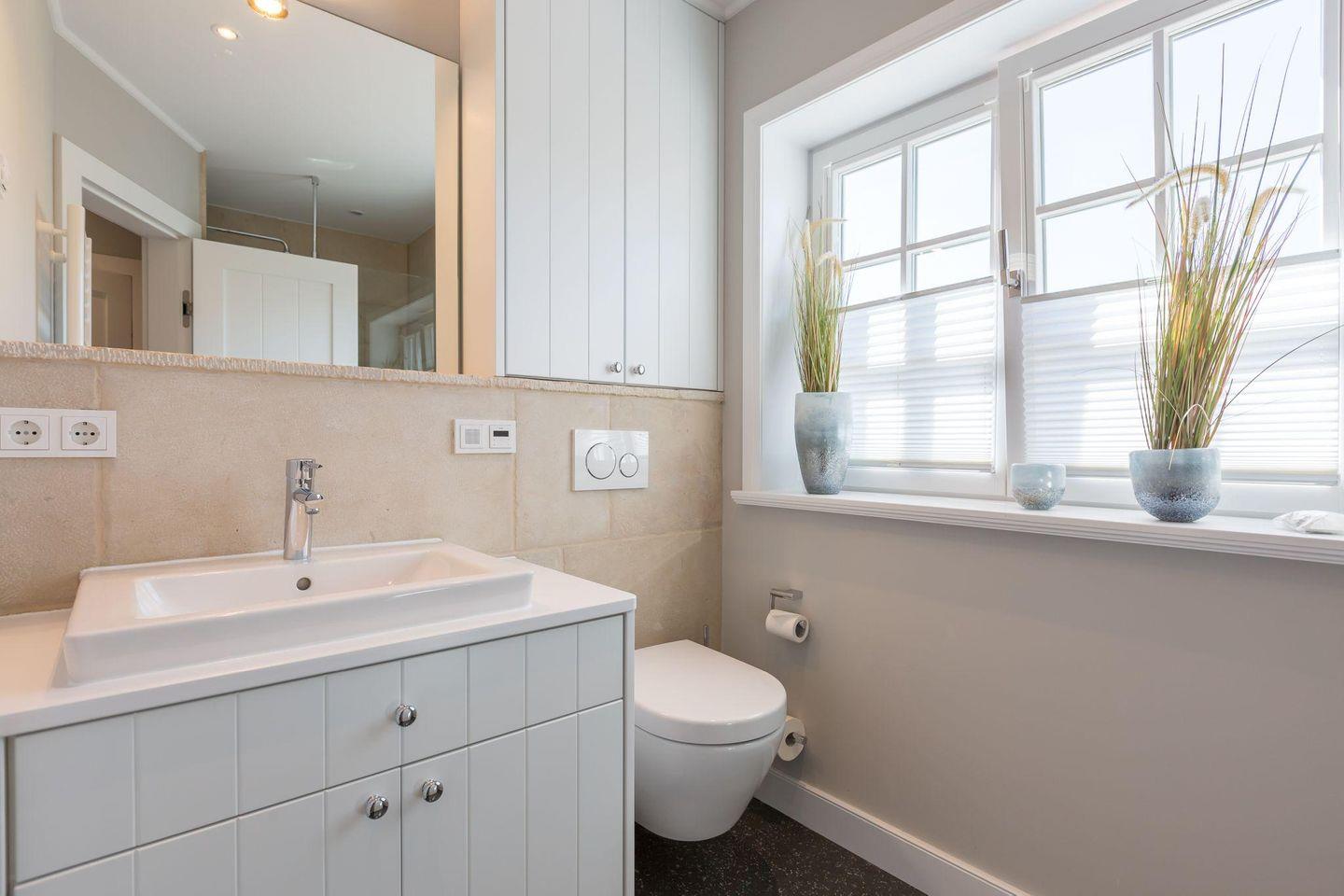Das moderne Badezimmer überzeugt mit einer ebenerdigen Dusche, WC, Handtuchwärmer, Föhn und Tageslicht. Der gemeinschaftliche Wellnessbereich des Hauses bietet eine Sauna, ein Dampfbad und eine erfrischende Schwalldusche – perfekt für entspannende Stunden nach einem Tag am Strand.