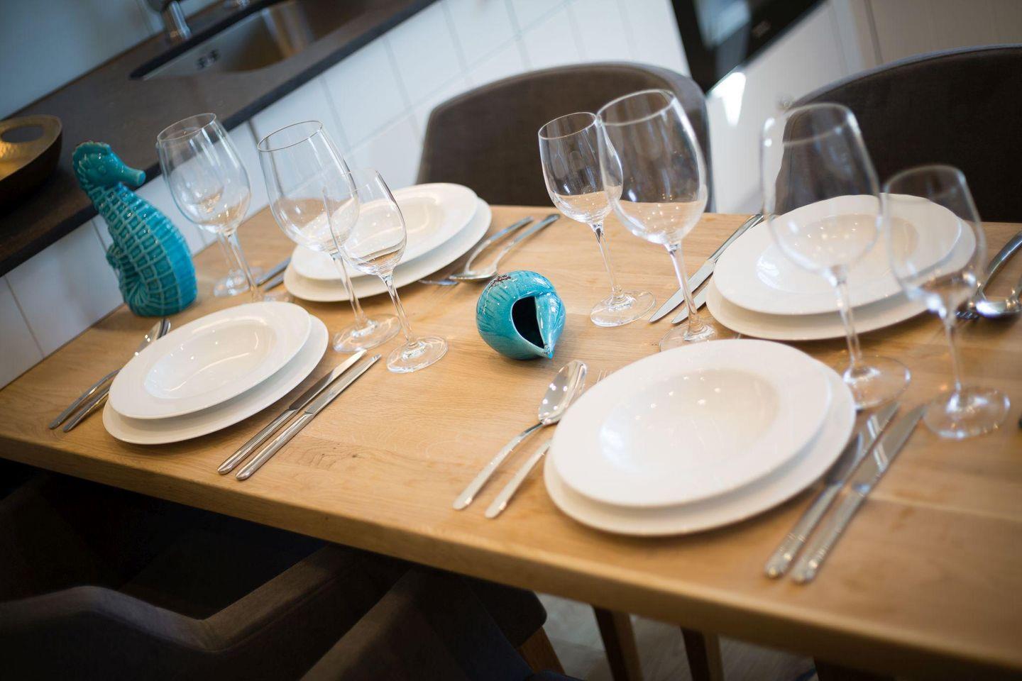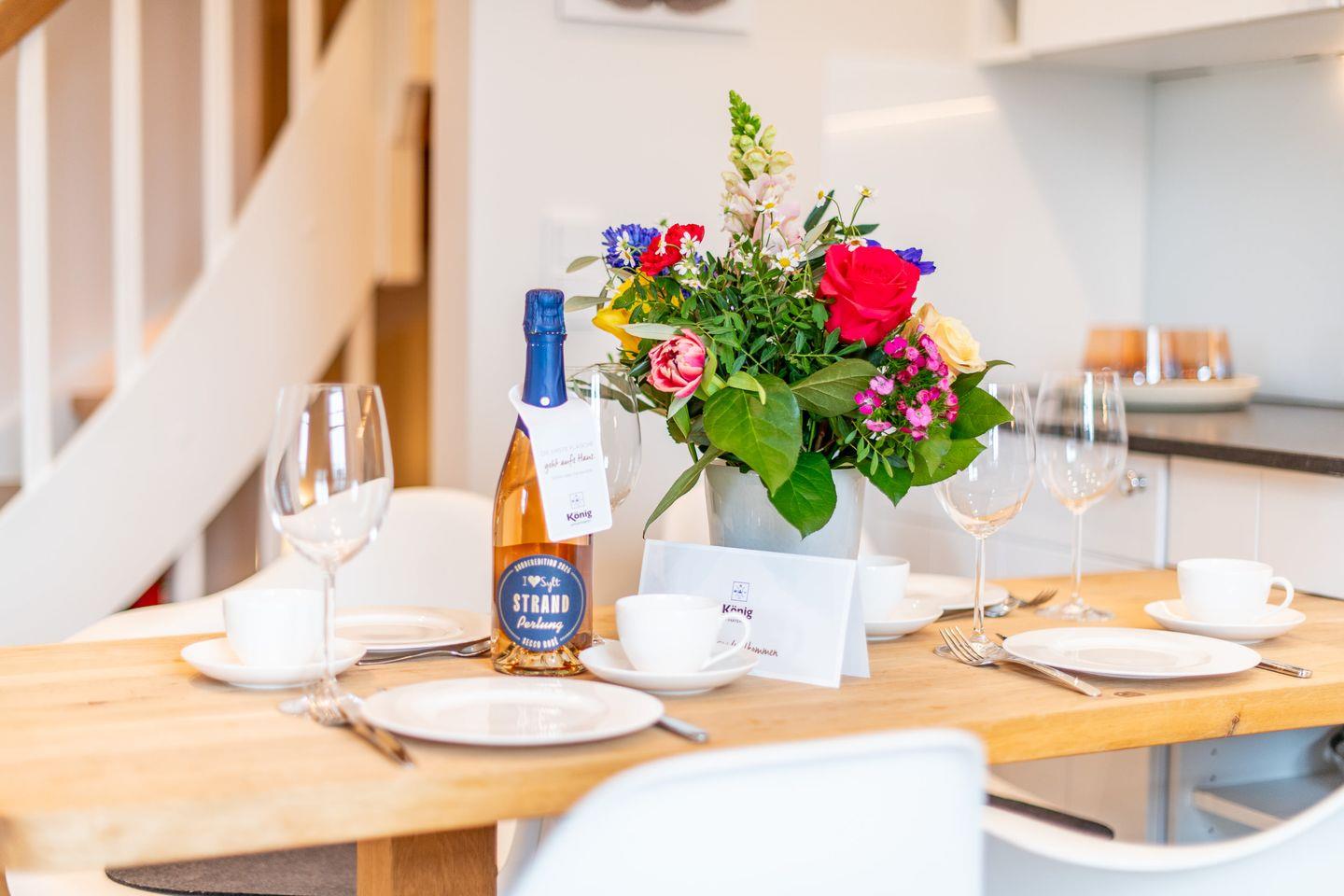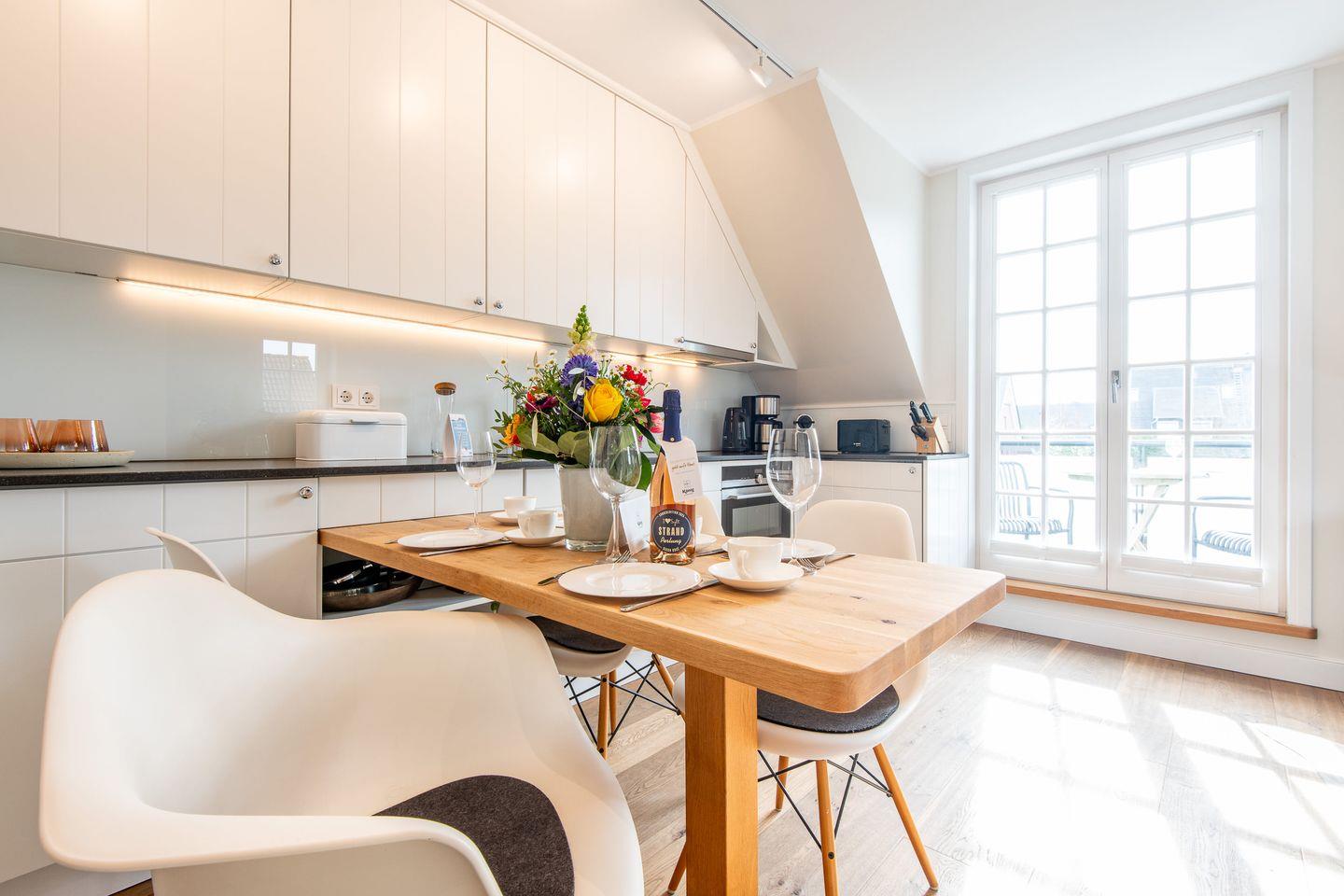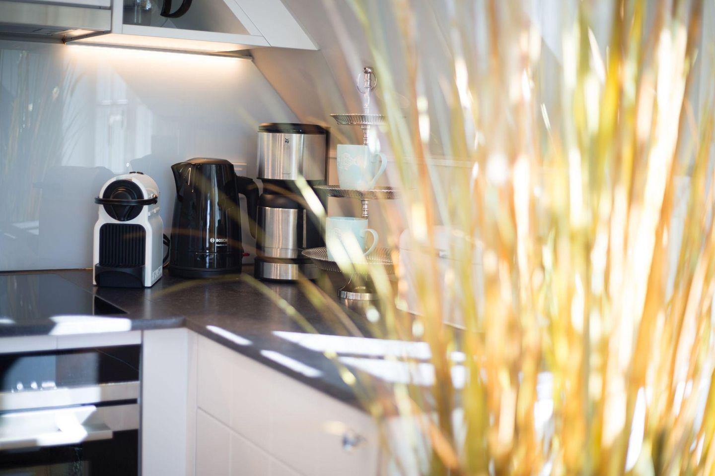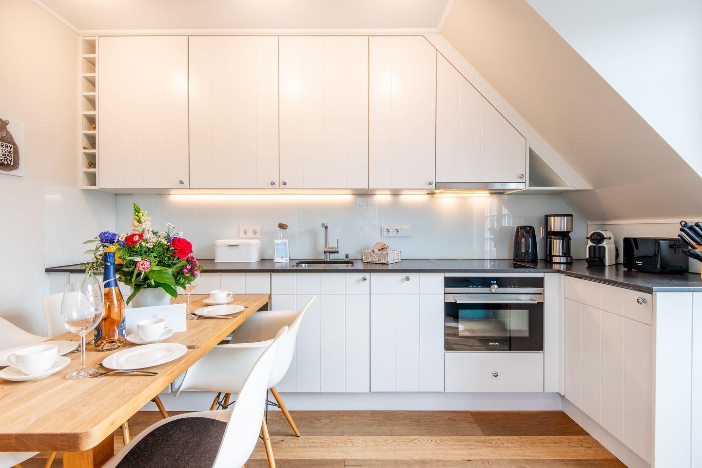 Die offene Küche ist mit allen modernen Annehmlichkeiten ausgestattet. Mit Cerankochfeld, Geschirrspüler und vielem mehr bietet sie alles, was Sie für die Zubereitung köstlicher Mahlzeiten benötigen – ideal für gemeinsame Kochabende in stilvollem Ambiente.