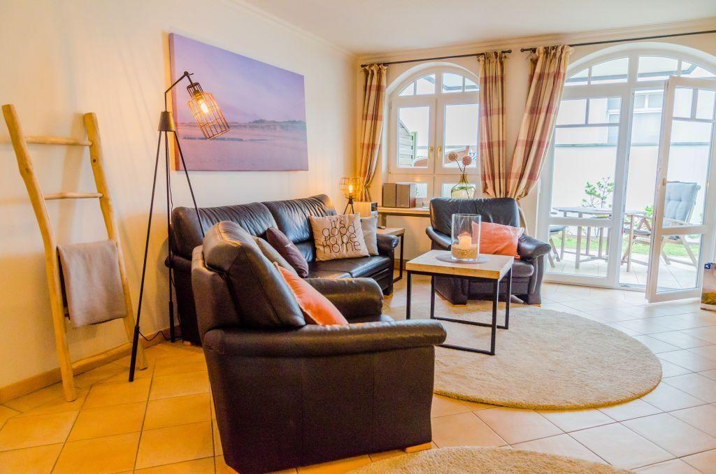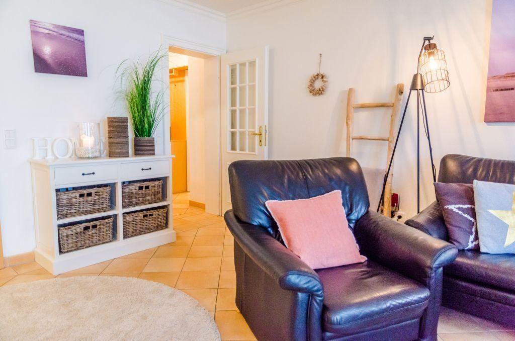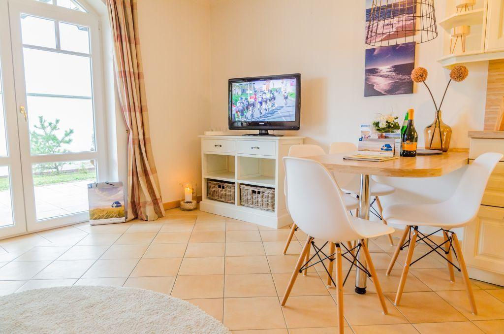 Das lichtdurchflutete Wohnzimmer ist mit einem bequemen Sofa, Sesseln, einem Esstisch für 4 Personen und einem TV ausgestattet. Von hier aus gelangen Sie direkt auf die möblierte Terrasse nach Süden, die mit einem Saisonstrandkorb (ca. Mai bis Oktober) ausgestattet ist – ideal zum Entspannen.