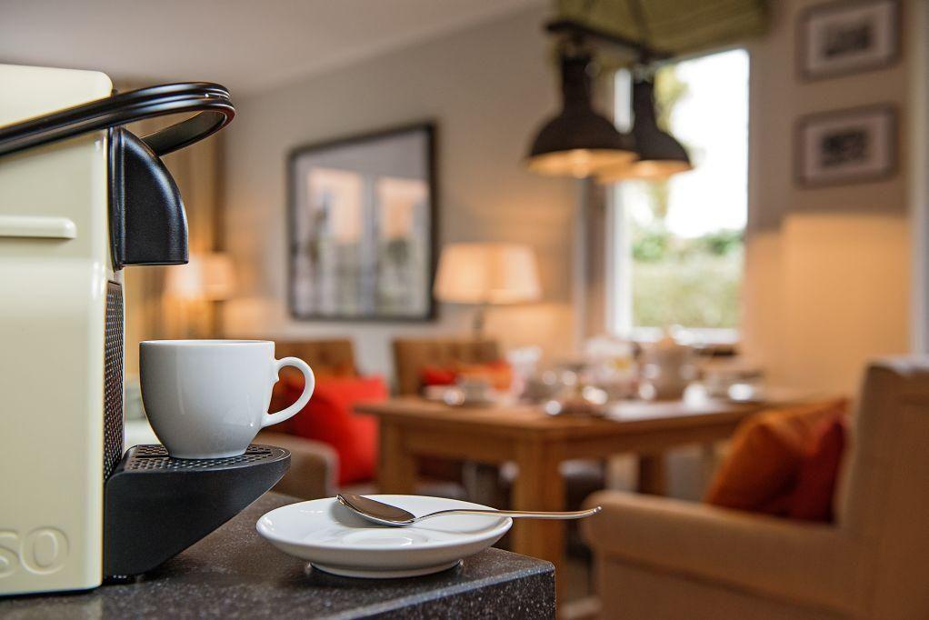 Die offene Küche ist mit allem ausgestattet, was Sie benötigen, einschließlich einer Nespresso-Maschine für einen entspannten Start in den Tag.
