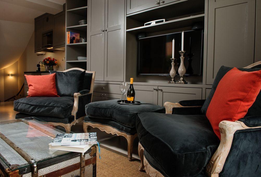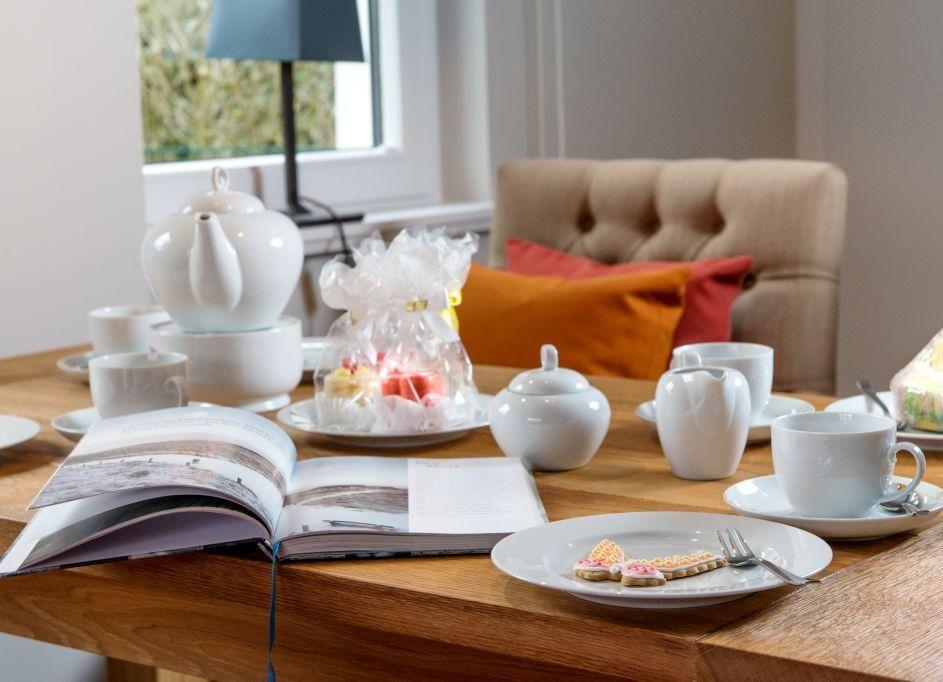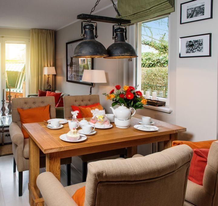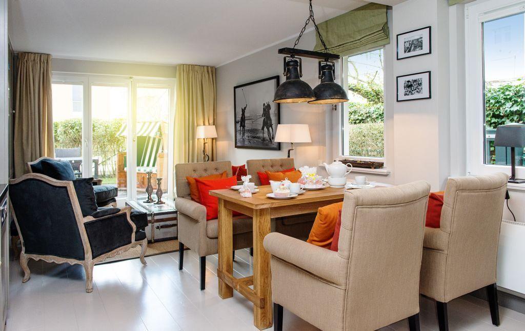 Das stilvoll eingerichtete Wohnzimmer verfügt über ein gemütliches Sofa, Sessel, einen modernen TV sowie einen Esstisch für 4 Personen. Von hier aus haben Sie direkten Zugang zur möblierten Terrasse nach Westen, die mit einem Strandkorb ausgestattet ist – perfekt, um die Abendsonne zu genießen.