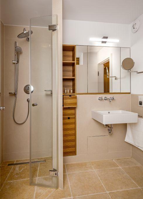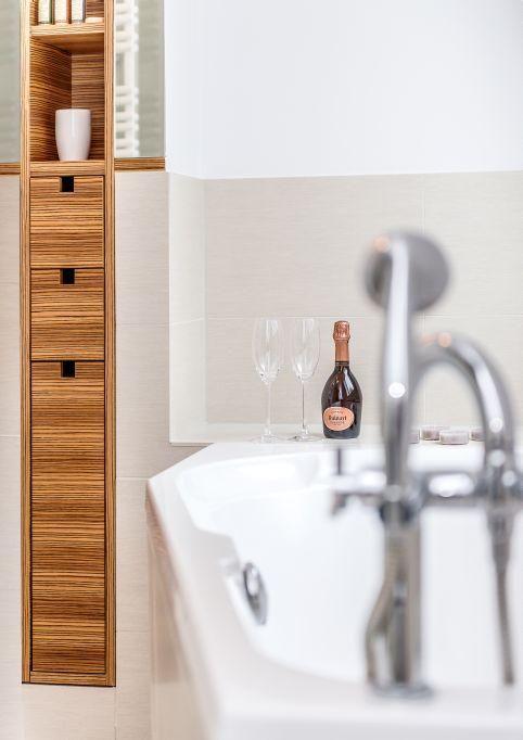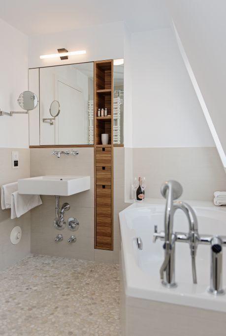 Das erste Badezimmer verfügt über eine Badewanne, Dusche, WC und Handtuchwärmer sowie Tageslicht. Der Natursteinfußboden sorgt für eine angenehme Atmosphäre. Das zweite Badezimmer ist mit einer Dusche, WC und ebenfalls einem Handtuchwärmer sowie Natursteinfußboden ausgestattet.