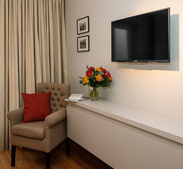 Beide Schlafzimmer sind ausgestattet mit Doppelbett (2x 90x200 cm), einem TV und Einbauschränken, die reichlich Stauraum bieten.