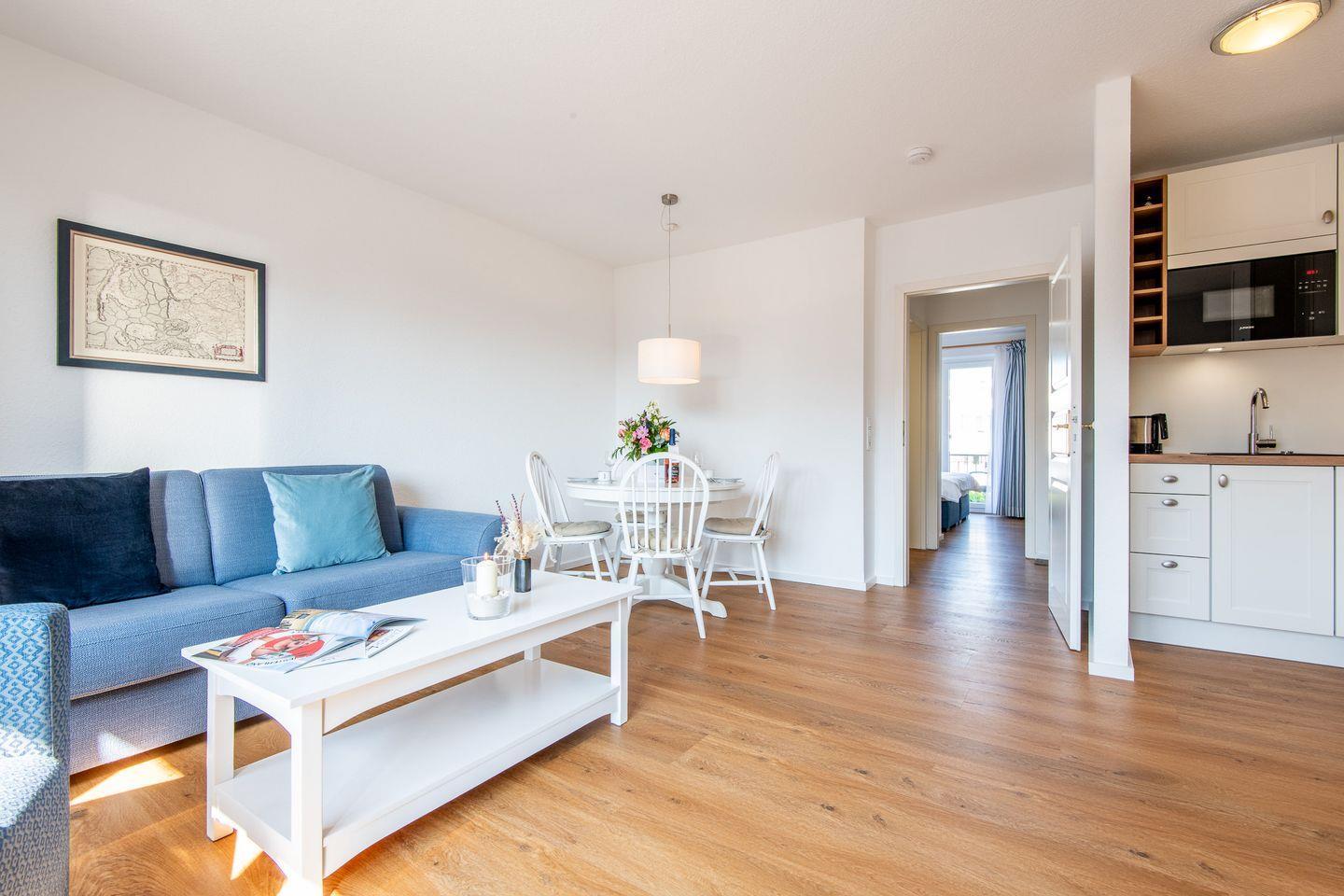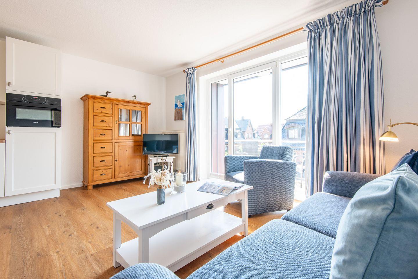 Das gemütliche Wohnzimmer ist mit einem Sofa, einem Sessel, einem TV und einem Esstisch für 4 Personen ausgestattet. Der direkte Zugang zum möblierten Balkon nach Westen lädt dazu ein, die Abendsonne zu genießen.