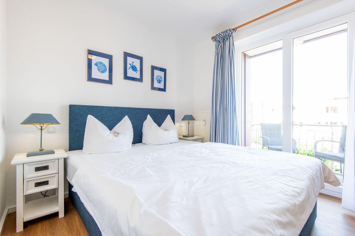 Das Schlafzimmer ist mit einem Doppelbett (2x 80x200 cm) und einem Kleiderschrank ausgestattet und bietet direkten Zugang zum möblierten Balkon nach Osten – ein idealer Platz für das Frühstück in der Morgensonne.