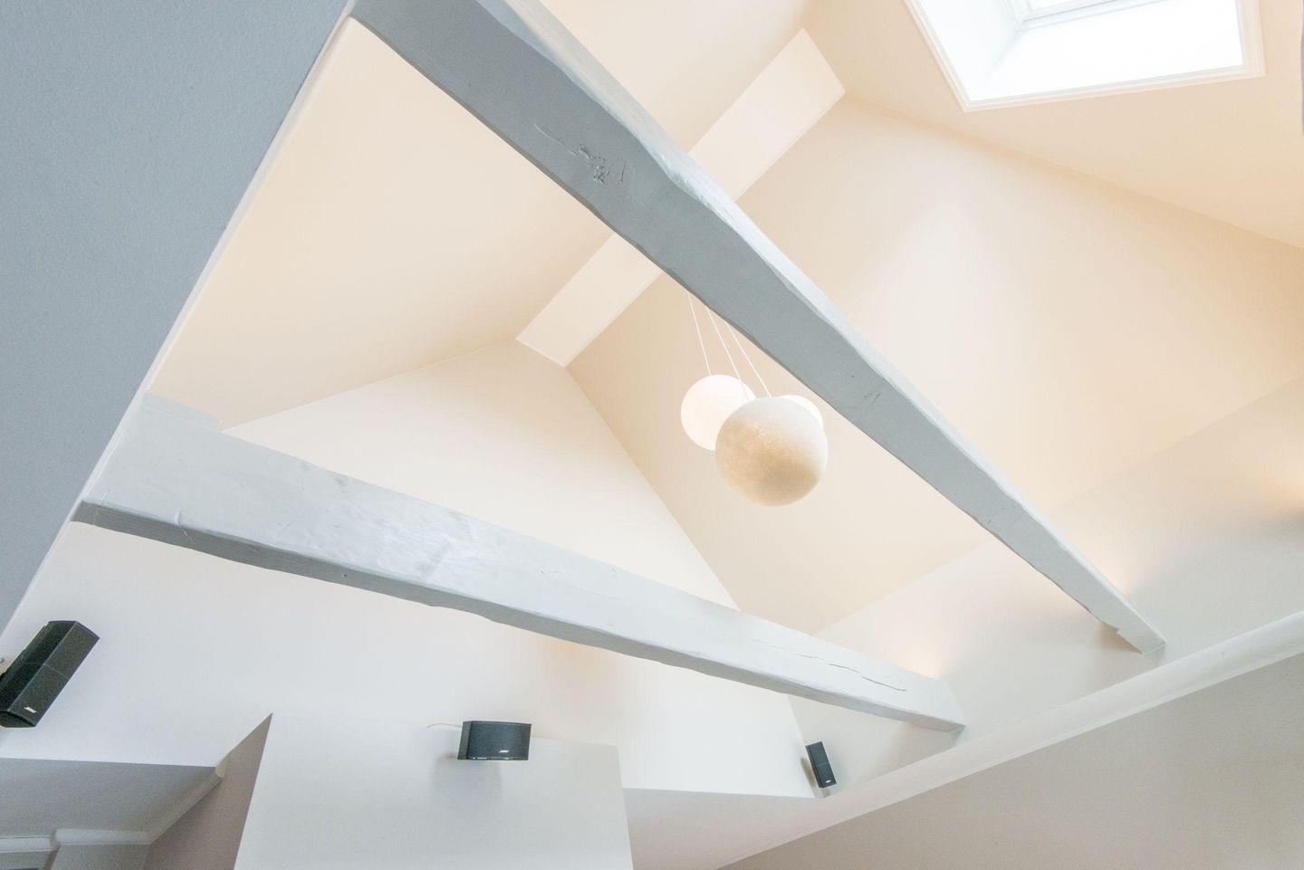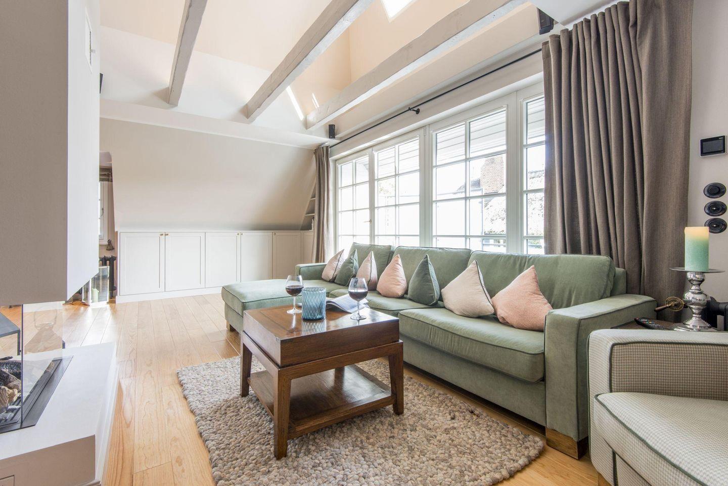 Das lichtdurchflutete Wohnzimmer im Loftstil besticht mit hohen Decken und sichtbarem Gebälk, das eine besondere Atmosphäre schafft. Der Kamin sorgt für gemütliche Stunden, während die Sofaecke und der TV einladen, die Abende entspannt zu genießen. Von hier aus haben Sie direkten Zugang zur großzügigen, windgeschützten Dachterrasse nach Süden, die mit bequemen Gartenmöbeln ausgestattet ist.