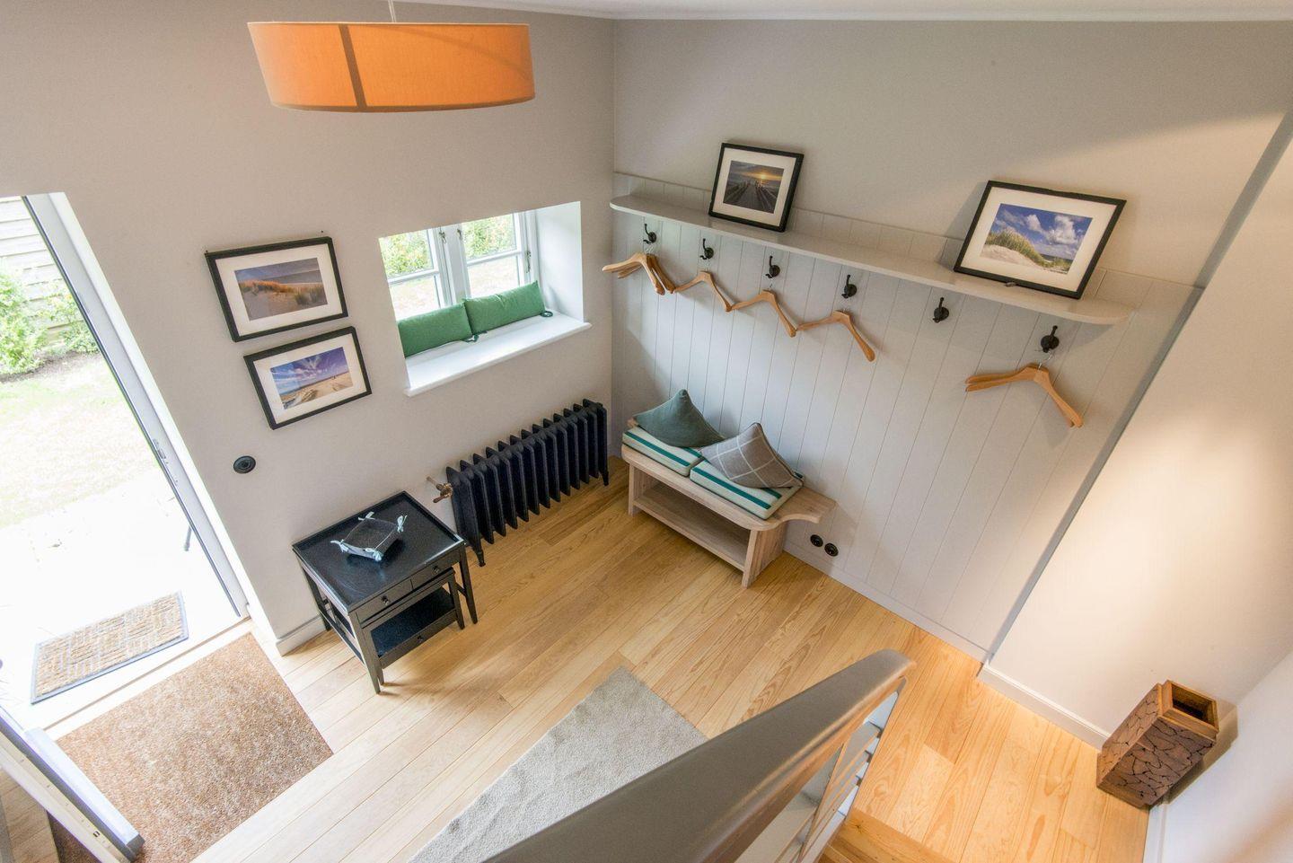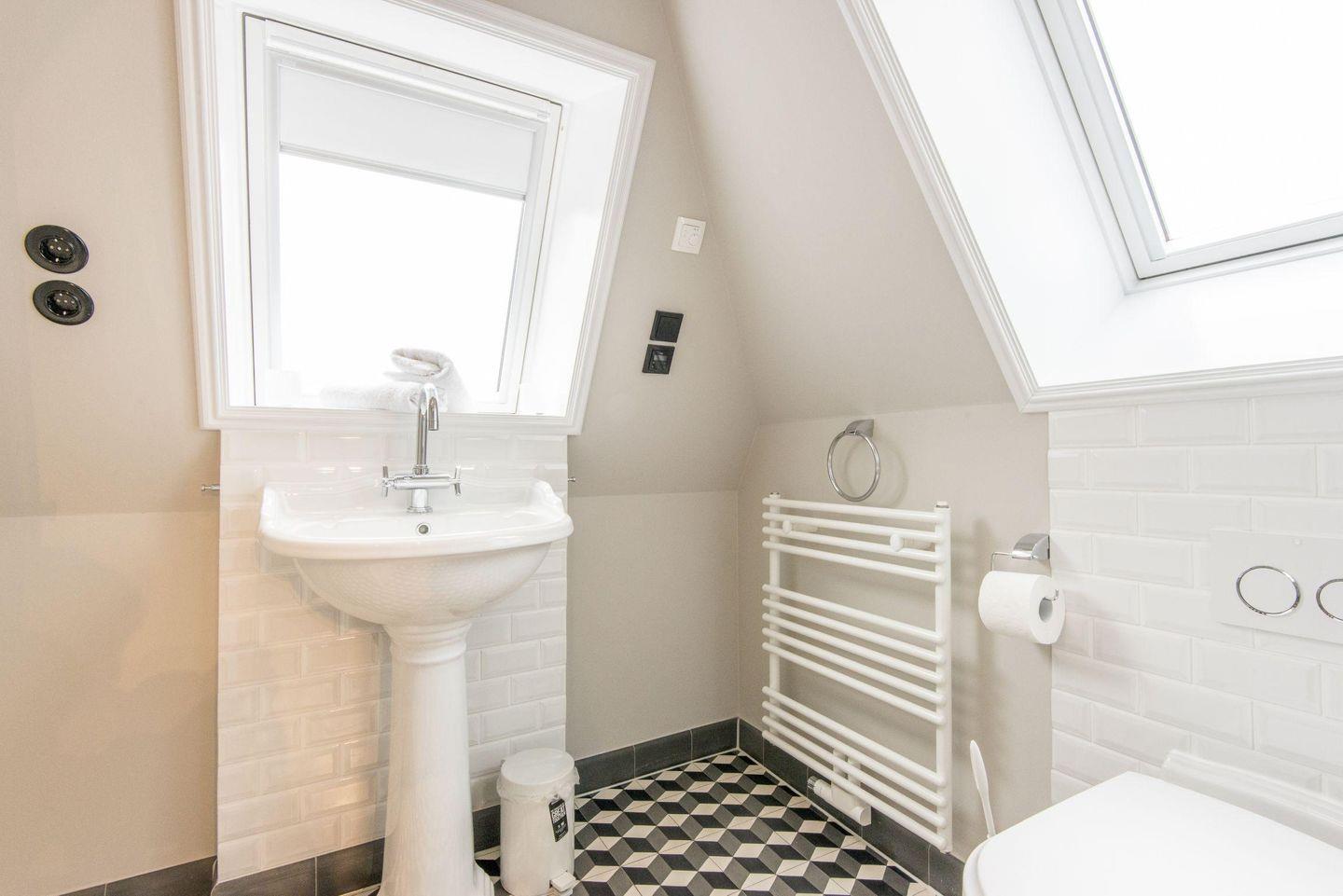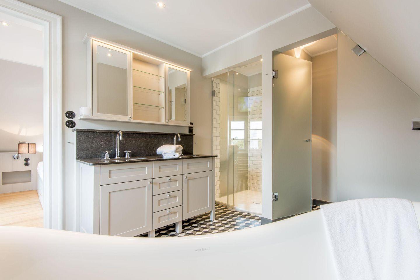 Das zweite Badezimmer verfügt über eine geräumige Dusche, WC, Handtuchwärmer, Föhn und Tageslicht – ein wunderbarer Ort, um sich nach einem Tag am Strand oder einer Wanderung zu erfrischen. Zudem erwartet Sie ein großzügiger Wellnessbereich mit Sauna im Haus, der zur Entspannung einlädt.