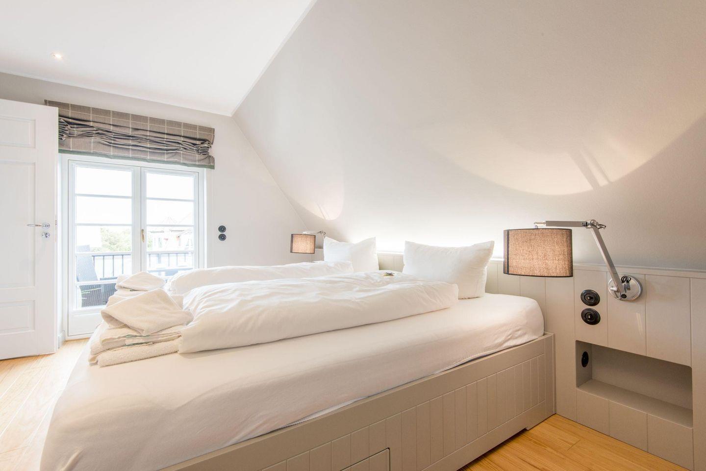 Im Obergeschoss erwartet Sie das erste Schlafzimmer, ausgestattet mit einem luxuriösen Doppelbett (2x 100x200 cm), einem geräumigen Einbauschrank, TV und einem eigenen Balkon nach Osten. Dieses Schlafzimmer verfügt über ein angrenzendes Badezimmer mit Badewanne, ebenerdiger Dusche, WC, zwei Waschbecken, Handtuchwärmer, Föhn und Tageslicht, das Ihnen reichlich Raum und Privatsphäre bietet.