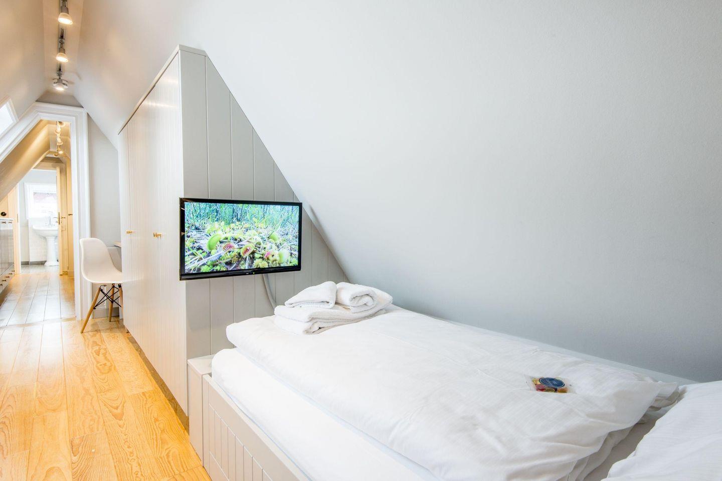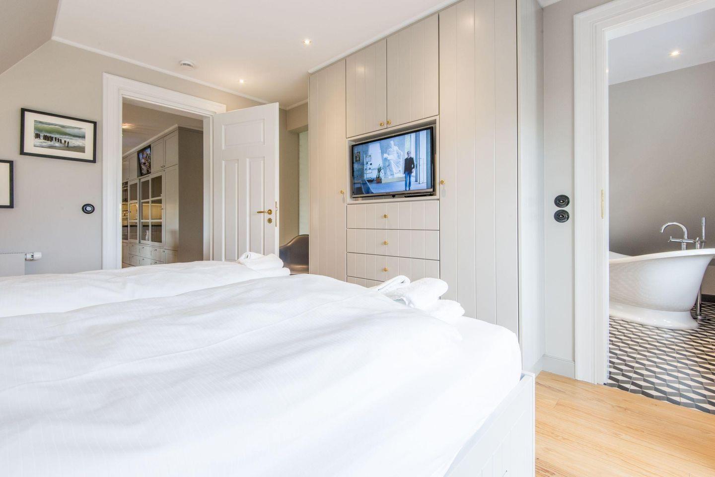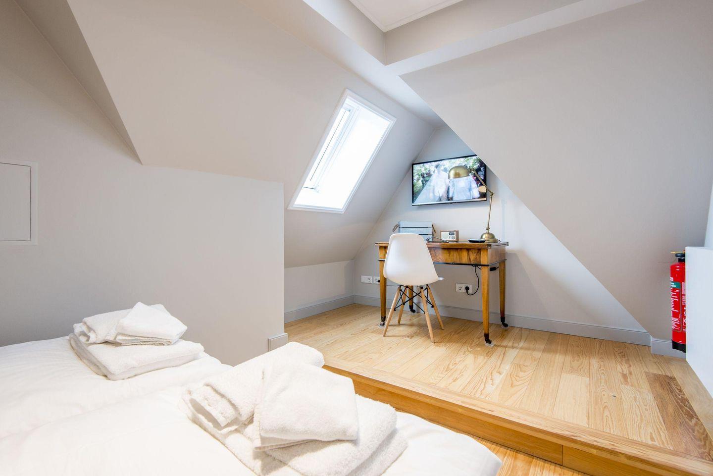 Das zweite Schlafzimmer ist mit einem komfortablen Doppelbett (2x 80x200 cm), Schreibtisch und TV ausgestattet und bietet eine stilvolle Ruheoase. Das dritte Schlafzimmer im Dachgeschoss verfügt über zwei Einzelbetten (je 90x200 cm), einen Einbauschrank, einen Schreibtisch und TV – ideal für entspannte Nächte.