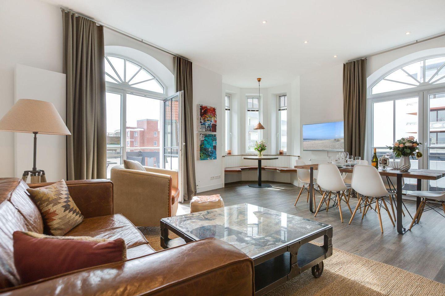 Der einladende Wohn- und Essbereich mit grandiosem Ausblick auf die Flaniermeile Friedrichstraße und das Meer bietet gemütliches Entspannen auf einem (Schlaf-) Sofa (140x190 cm), ergänzt durch Sessel und TV. Der Essbereich mit uriger Sitzbank im Turm des Hauses bietet Ihnen einen einzigartigen Rundum-Ausblick. Der direkte Zugang zum Balkon nach Süden lädt Sie ein, die Sonne und frische Luft zu genießen.