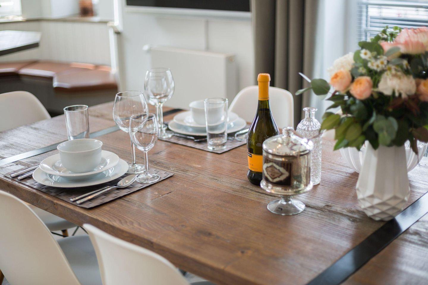 Die offene Küche fügt sich harmonisch in den Wohnbereich ein und ist mit modernem Komfort ausgestattet, ideal für die Zubereitung von Mahlzeiten. Ein großer Esstisch mit sechs Stühlen bietet ausreichend Platz für entspannte Mahlzeiten und gesellige Abende.