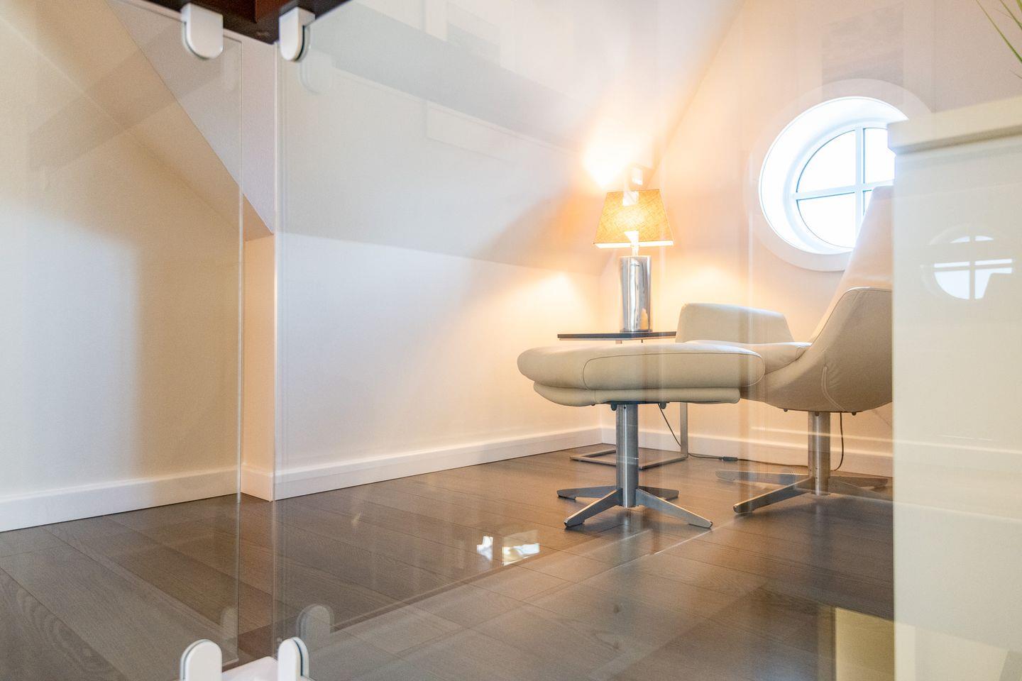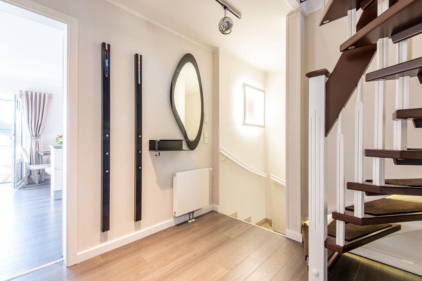 Ein kleiner, offener Ruheraum mit Sessel und Kommode im Dachgeschoss bietet zusätzlichen Rückzugsort. Pkw-Stellplatz, Waschmaschine, Trockner und WLAN (ohne Gewähr) sind vorhanden.