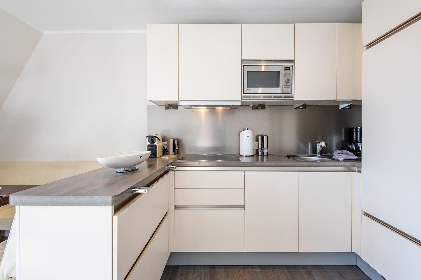 Die offene Küche ist komplett ausgestattet und mit einer Filterkaffeemaschine und weiteren Annehmlichkeiten für die Zubereitung köstlicher Mahlzeiten eingerichtet.