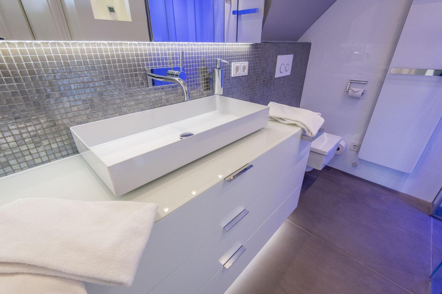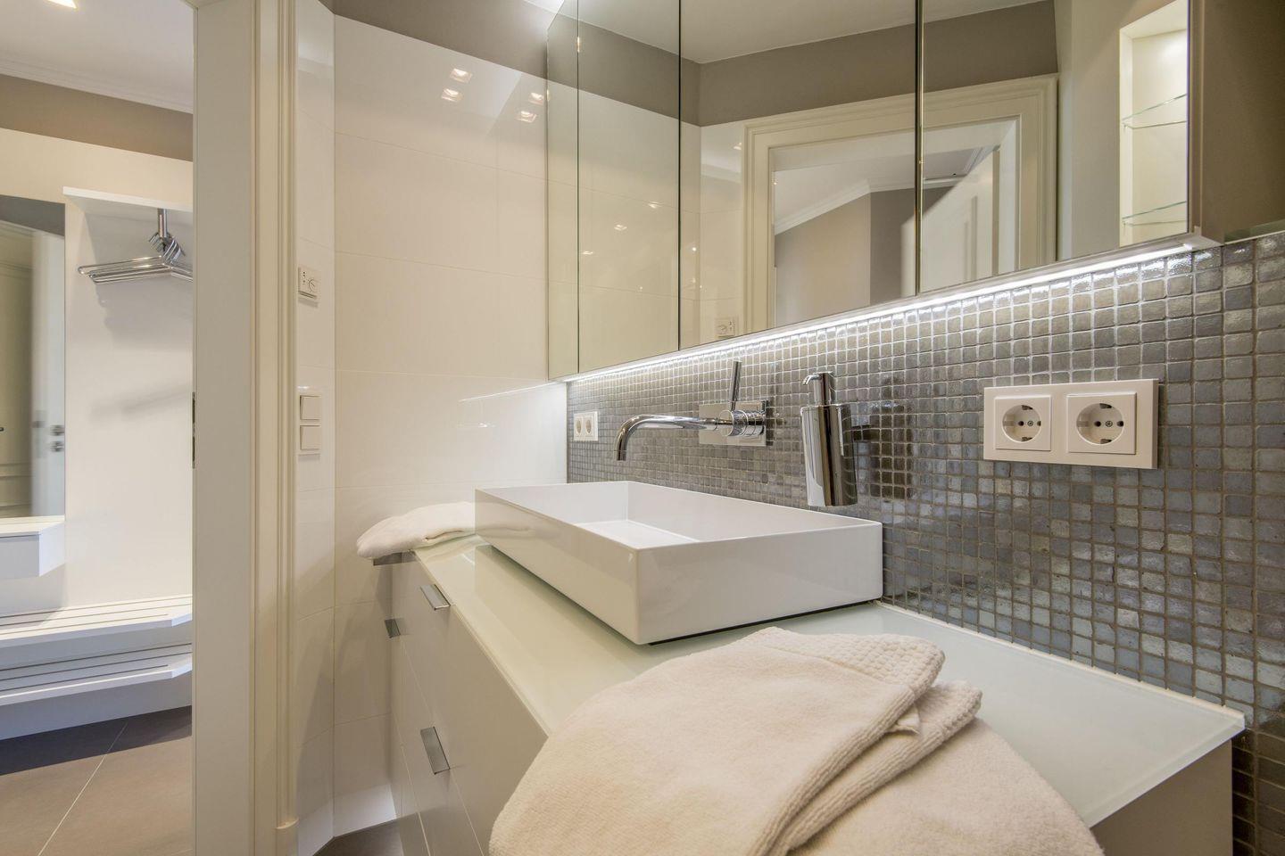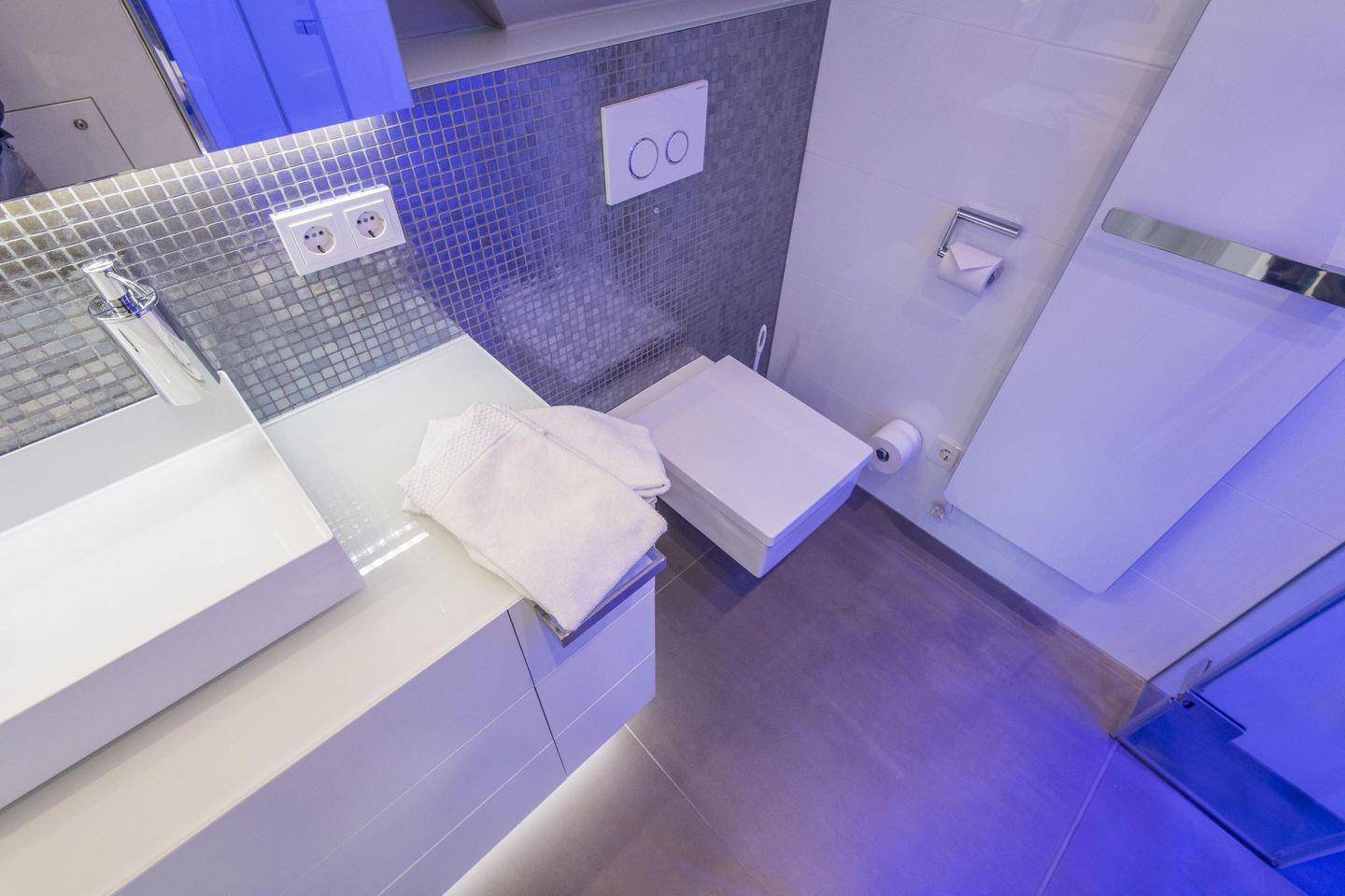 Das Badezimmer ist ein besonderes Highlight und bietet eine Dusche mit integrierter Dampfbad-Funktion und Musiksystem, ein WC sowie einen Handtuchwärmer – ideal für entspannende Wellness-Momente nach einem Strandtag.