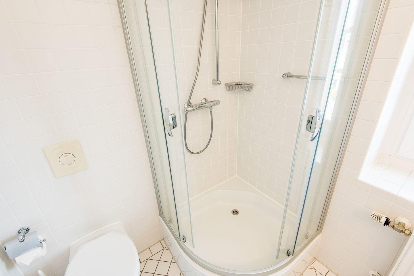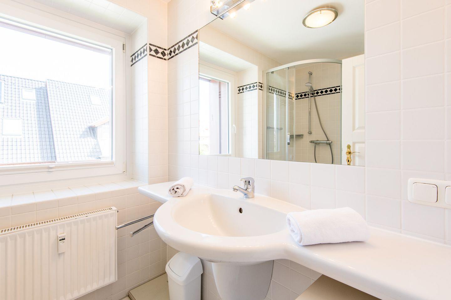 Das Badezimmer verfügt über eine Dusche, WC, Föhn und Tageslicht und sorgt für einen frischen Start in den Tag.