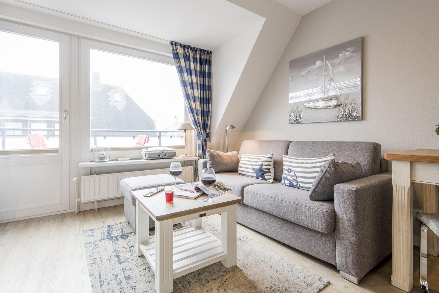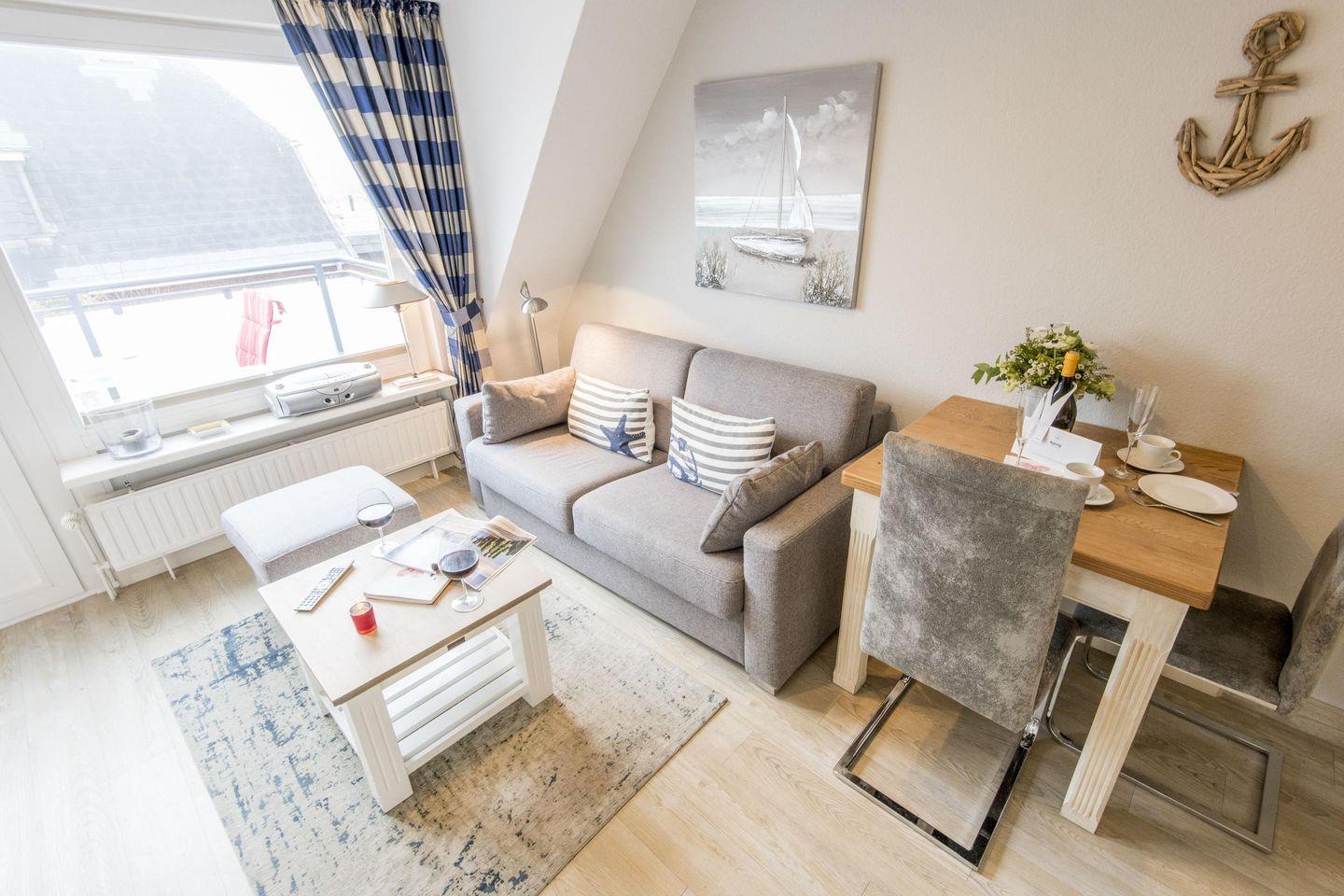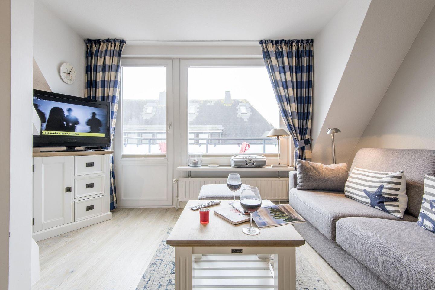 Das Wohnzimmer bietet ein ausziehbares Schlafsofa, einen Esstisch mit zwei Stühlen und einen TV. Vom Wohnzimmer aus gelangen Sie auf den möblierten West-Balkon mit einem wunderbaren kleinen Blick auf die Dünen.