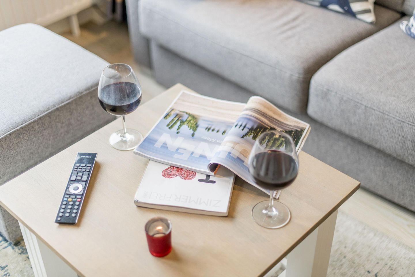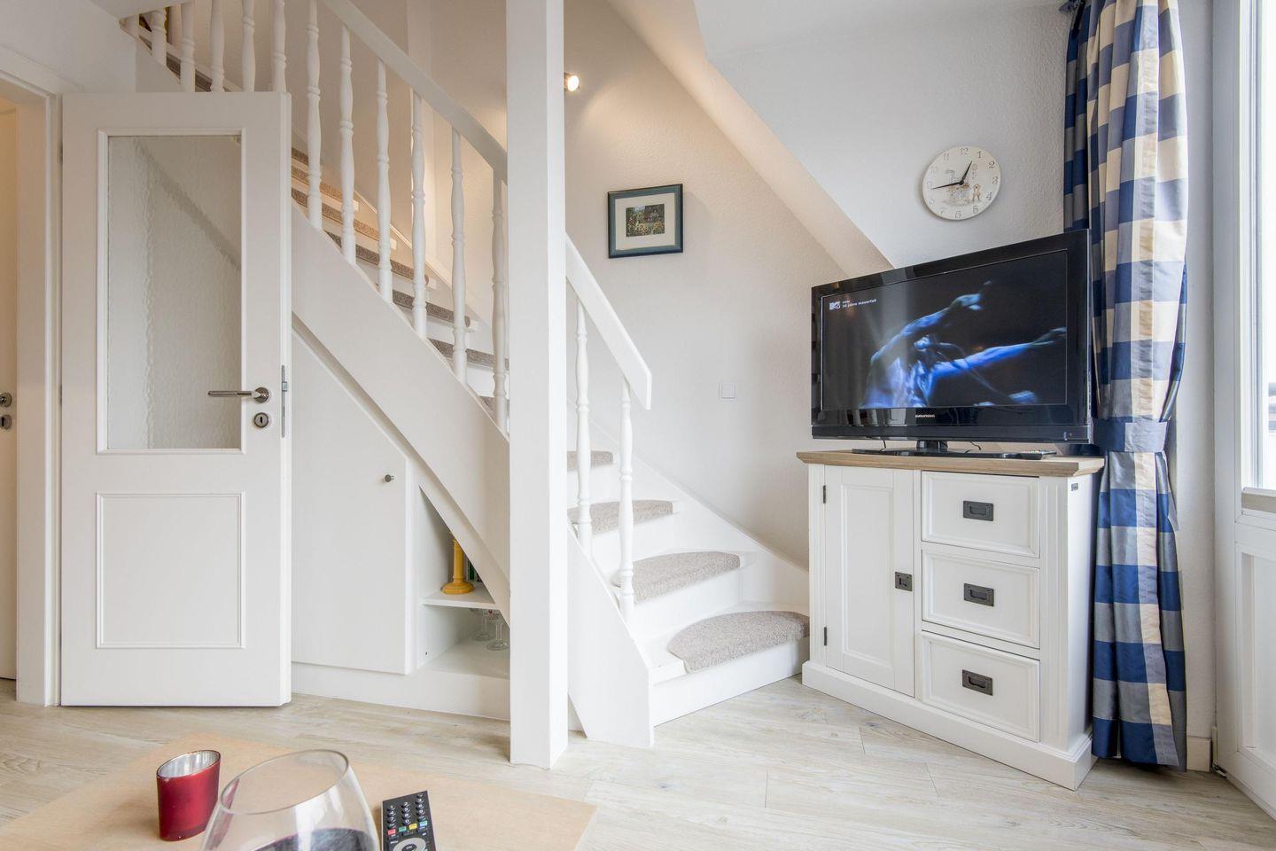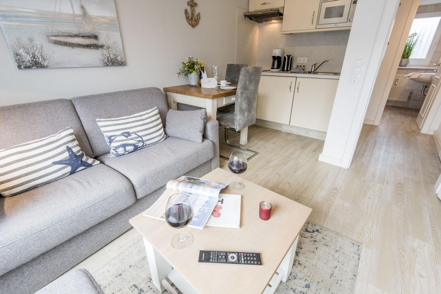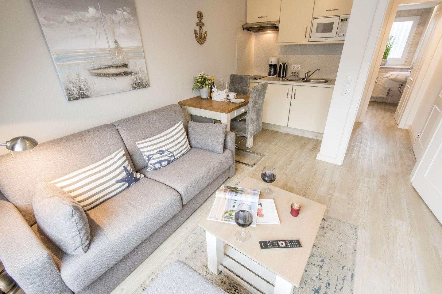 Das Wohnzimmer bietet ein ausziehbares Schlafsofa, einen Esstisch mit zwei Stühlen und einen TV. Vom Wohnzimmer aus gelangen Sie auf den möblierten West-Balkon mit einem wunderbaren kleinen Blick auf die Dünen.