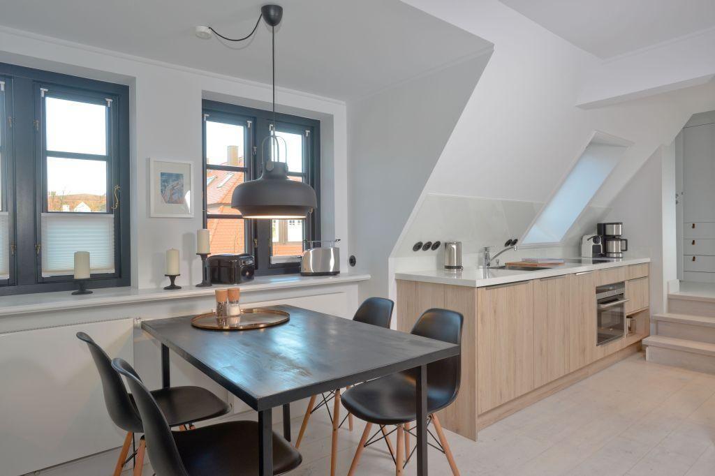 Die offene Küche ist voll ausgestattet und lässt keine Wünsche offen. Mit einem Induktionsherd, einem Geschirrspüler, einer Filterkaffee- sowie einer Espressomaschine bietet sie alles, was Sie für die Zubereitung Ihrer Mahlzeiten benötigen – perfekt für gesellige Abende.
