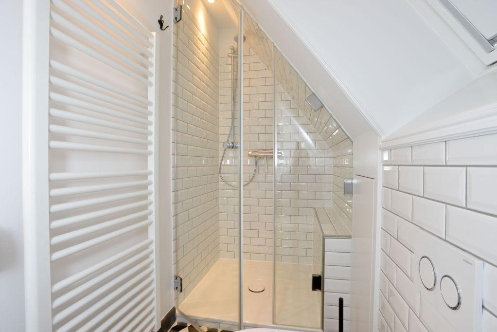 Die Wohnung verfügt über zwei moderne Badezimmer mit hochwertigen Duschen, WC, Föhn und Handtuchwärmer. Das zweite Badezimmer bietet zudem Tageslicht, was den Raum besonders freundlich und einladend macht.