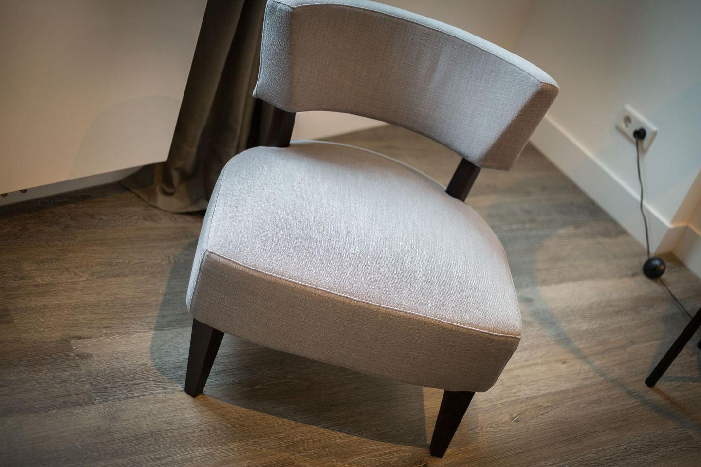 Der Wohnbereich ist komfortabel mit einem Sofa, einem Sessel und einem TV eingerichtet, sodass Sie hier entspannte Abende verbringen können. Durch die großen Fenster wird der Raum von natürlichem Licht durchflutet und lädt zu ruhigen Stunden ein.