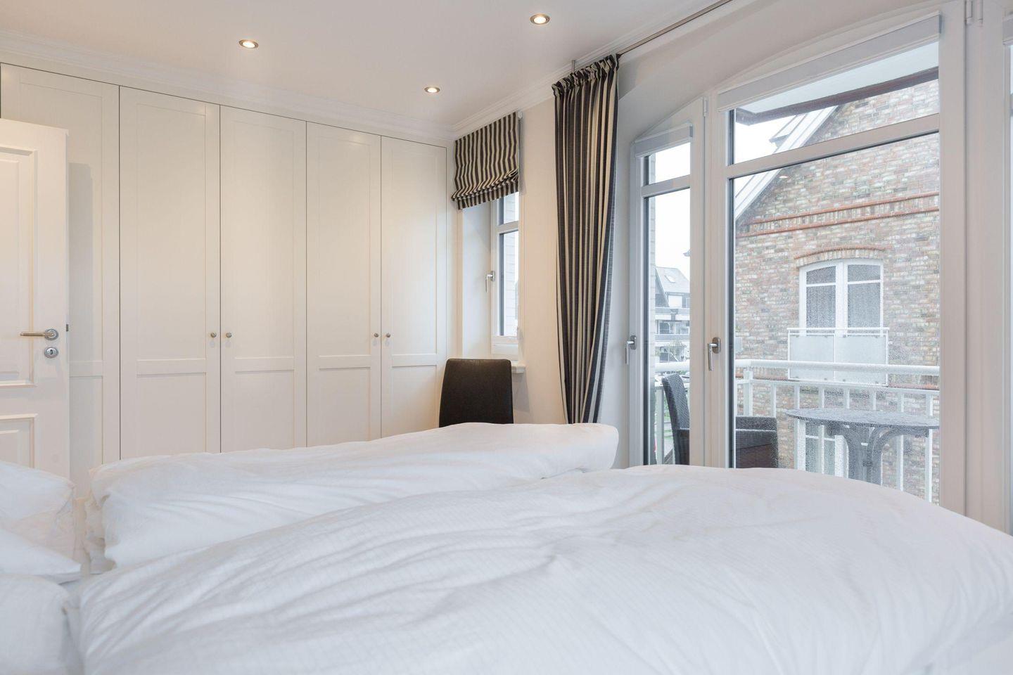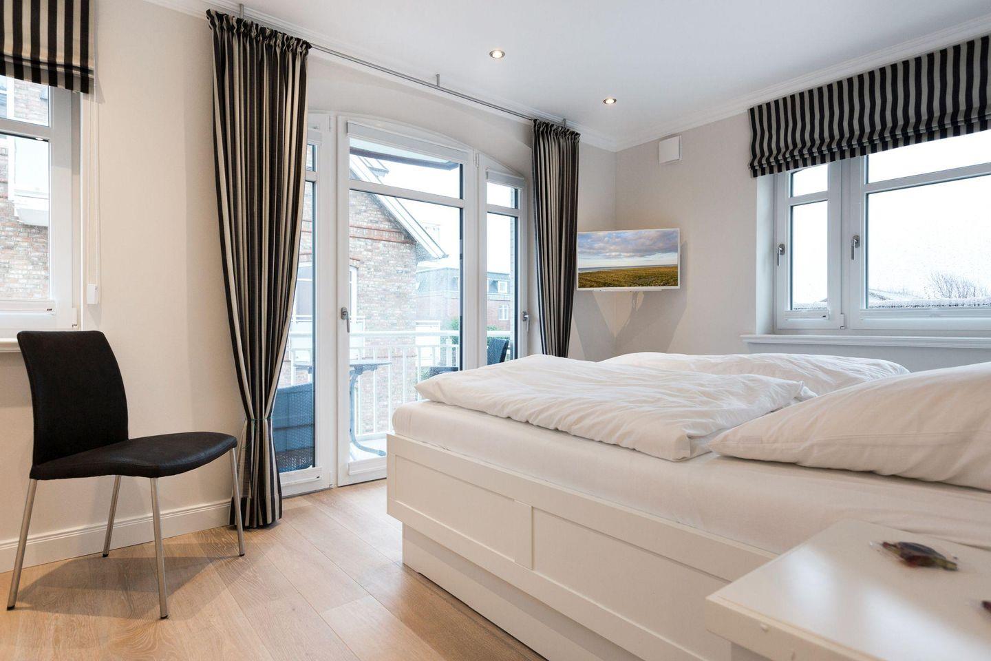 Das Schlafzimmer ist mit einem komfortablen Doppelbett (2 x 90x200 cm) und einem Einbauschrank ausgestattet und bietet ein gemütliches Ambiente für erholsame Nächte. Von hier aus gelangen Sie direkt auf den Ostbalkon, ideal für entspannte Stunden in der Morgensonne. Das moderne Badezimmer ist ein weiteres Highlight und überzeugt mit einer ebenerdigen Dusche, WC, Handtuchwärmer und Fön – hier beginnt jeder Urlaubstag frisch und erholt.