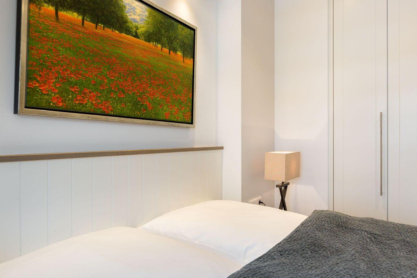 Die Wohnung verfügt über zwei geschmackvoll eingerichtete Schlafzimmer. Das Hauptschlafzimmer bietet ein komfortables Doppelbett (2x 90x200 cm), einen geräumigen Einbauschrank und ein TV. Auch das zweite Schlafzimmer ist mit einem Doppelbett (2x 80x200 cm), einem Einbauschrank und einem TV ausgestattet und bietet ebenfalls hohen Komfort.