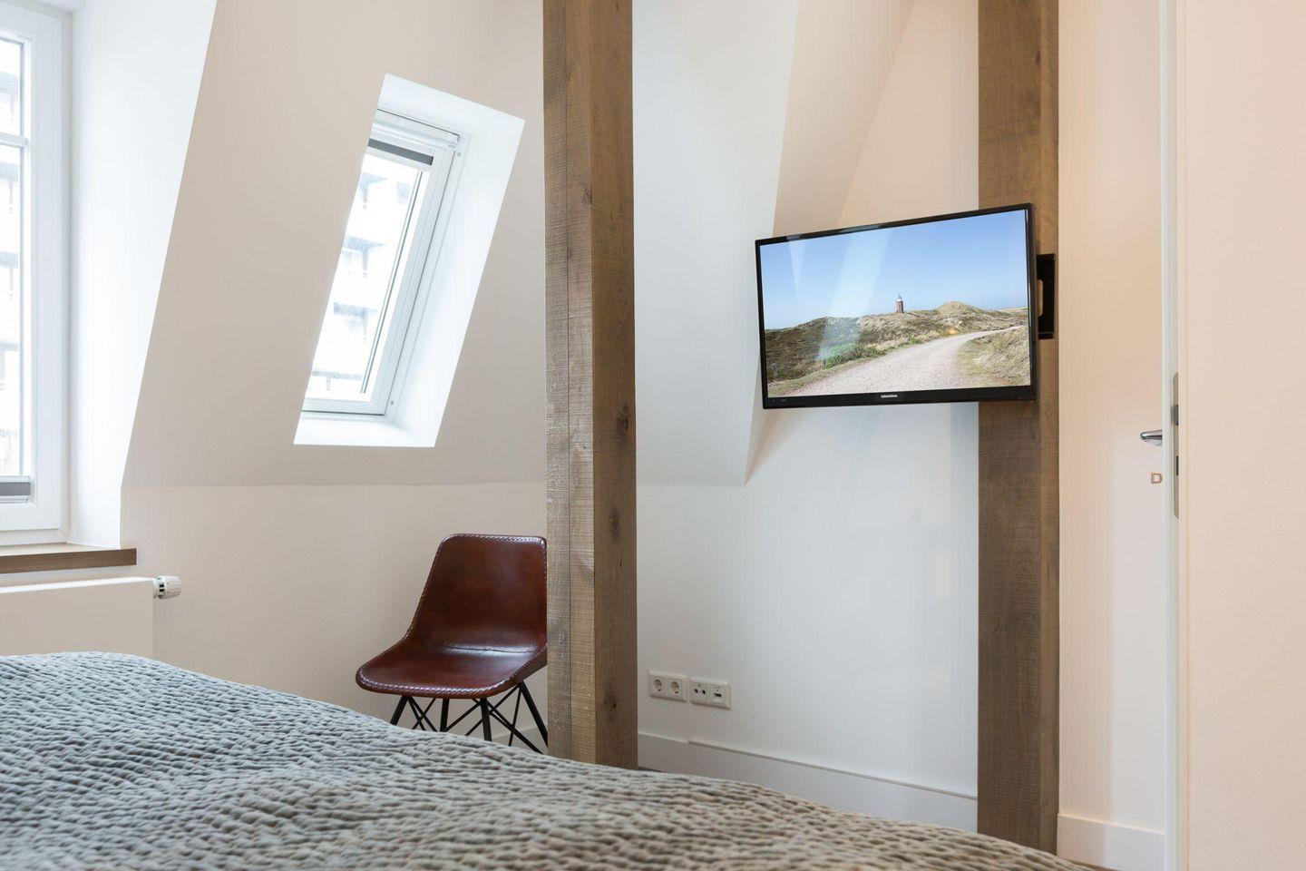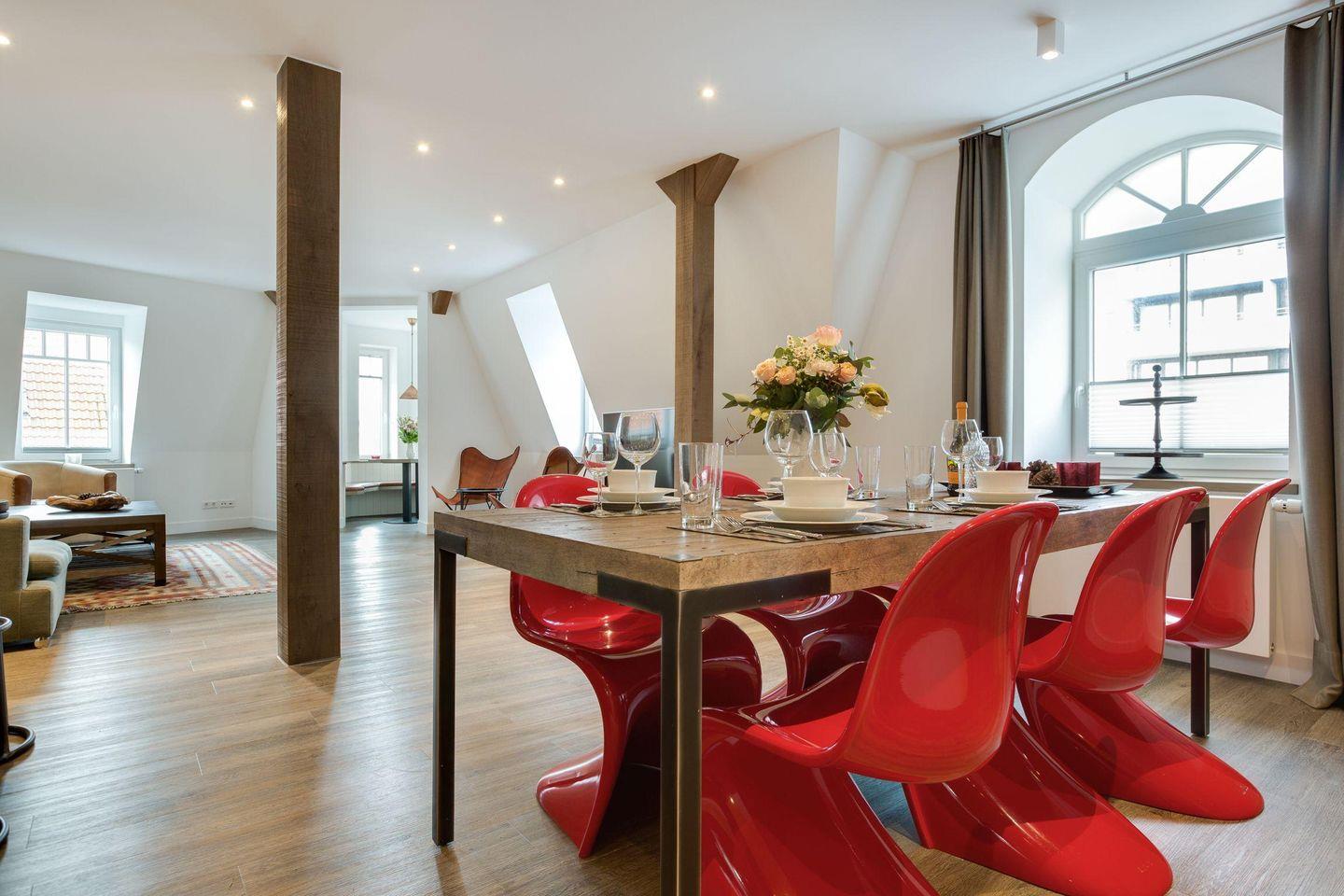 Das großzügige Wohnzimmer lädt mit einem herrlichen Ausblick auf die belebte Friedrichstraße und das Meer zu entspannten Momenten ein. Ein bequemes Ecksofa, stilvolle Sessel und ein TV bieten eine komfortable Einrichtung. Ein weiterer Sitzbereich mit rustikaler Rundbank ist im Turm des Hauses platziert und gewährt einen einzigartigen Rundum-Ausblick – perfekt für gesellige Mahlzeiten in besonderer Atmosphäre.