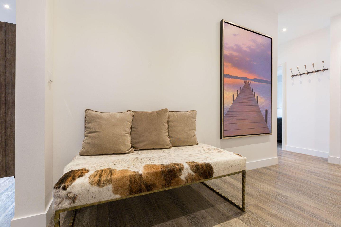 Die exklusive 3-Zimmer-Ferienwohnung 'Superdet' mit ca. 101 m² auf einer Ebene (3. OG, Fahrstuhl vorhanden) bietet Platz für bis zu 4 Personen und liegt in bester Lage in Westerland auf Sylt, nur 150 Meter vom Strand entfernt. Das traditionsreiche Hotel 'Seeburg' wurde in Zusammenarbeit mit der Kunstgalerie Mensing im Zeichen der Kunst modern umgestaltet, wobei jede Wohnung einem Künstler gewidmet ist und im charmanten Retro-Look eingerichtet wurde. Ausgestattet mit hochwertigem Mobiliar aus Frankreich, Belgien und England, bietet die Wohnung eine luxuriöse Wohlfühlatmosphäre der Extraklasse. Haustiere sind nicht gestattet.
