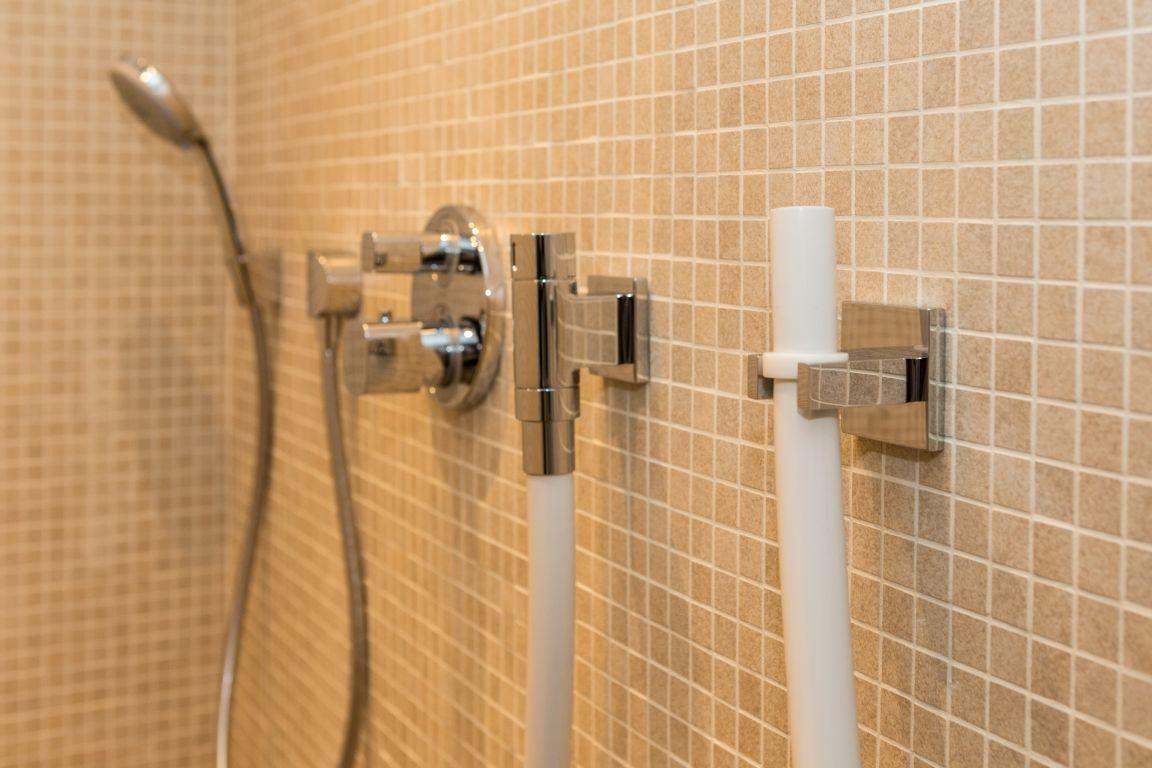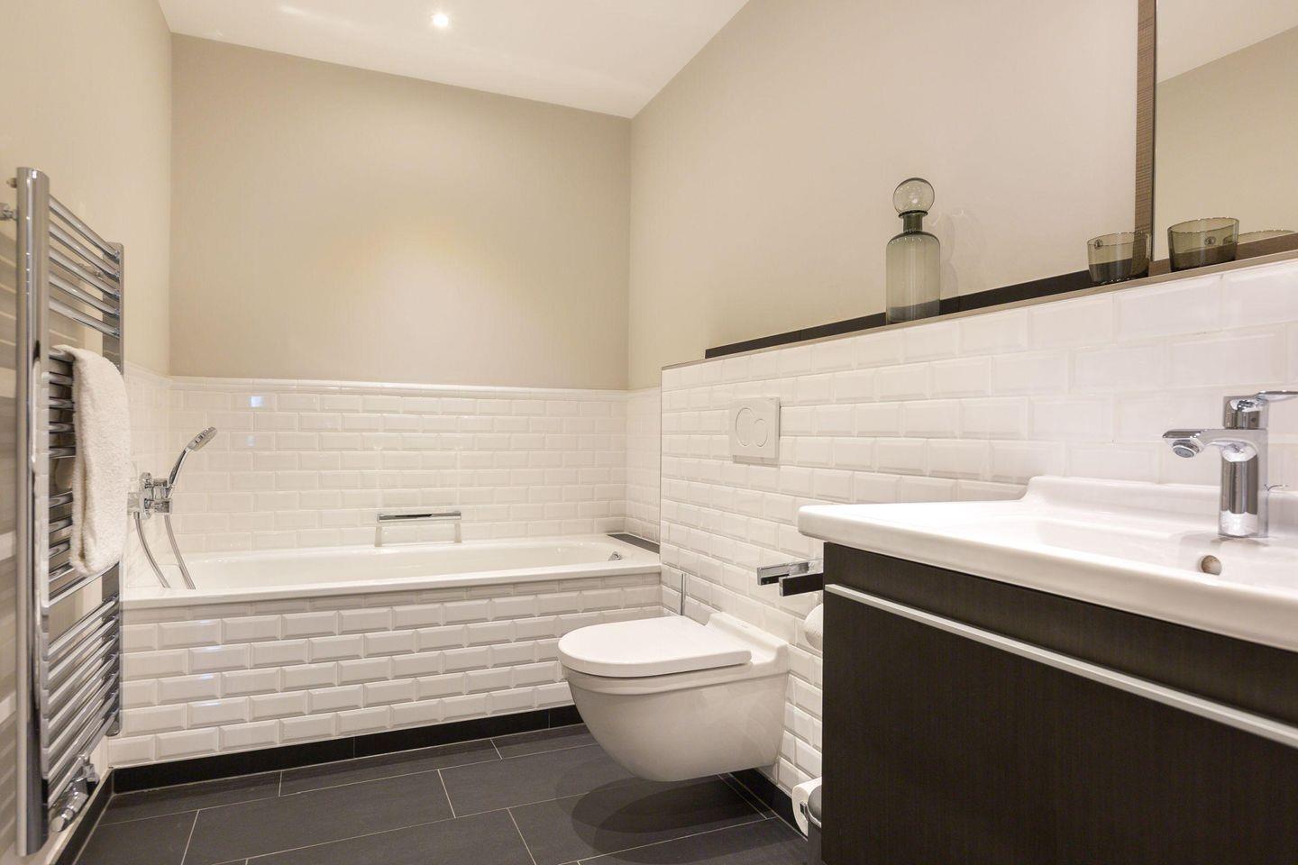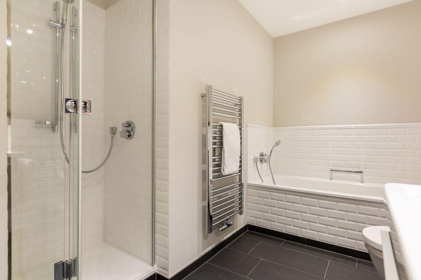 Das elegante Badezimmer ist mit einer Badewanne, separater Dusche, WC, Fön und Handtuchwärmer ausgestattet. Ein separates Gäste-WC sorgt für zusätzlichen Komfort.
