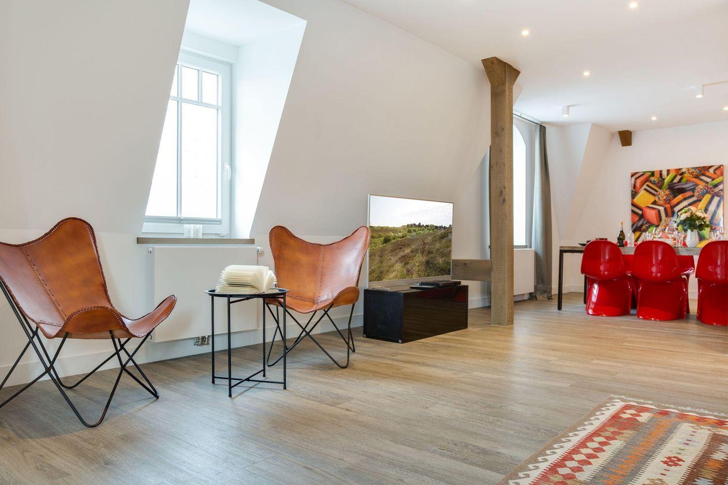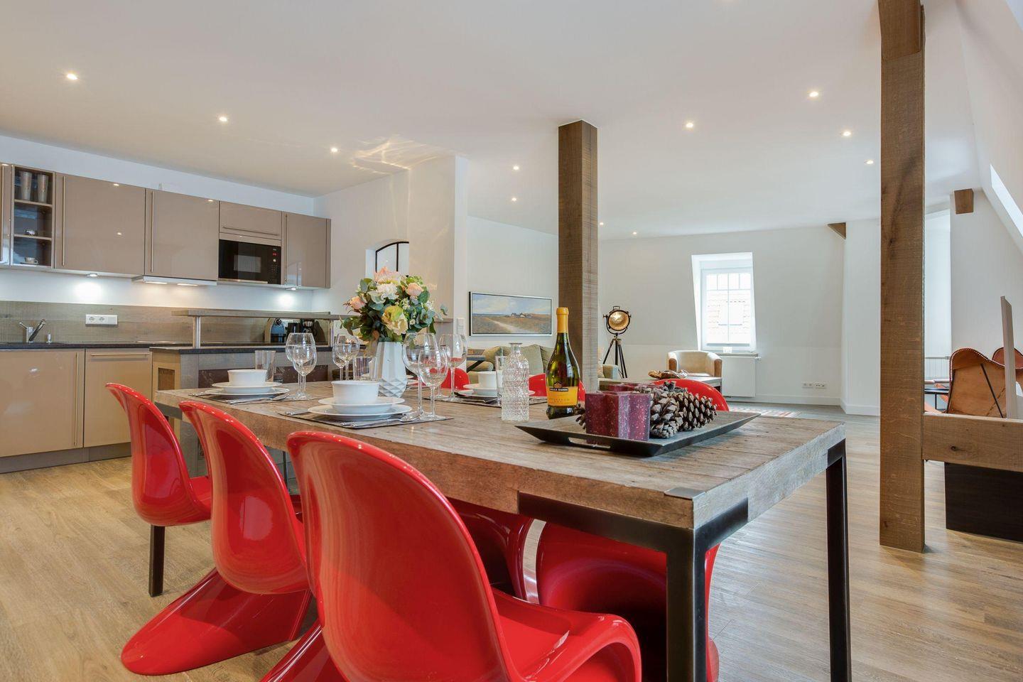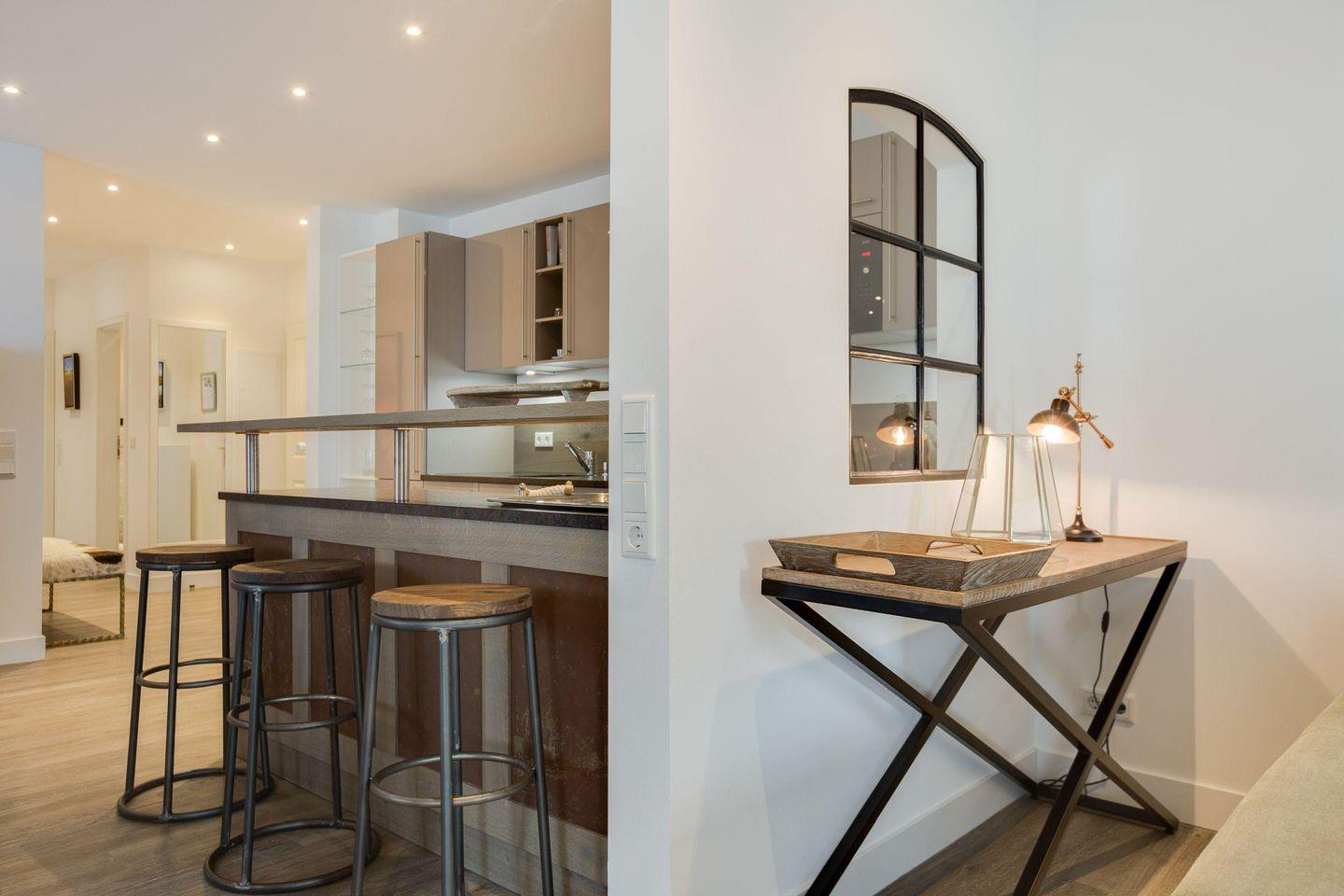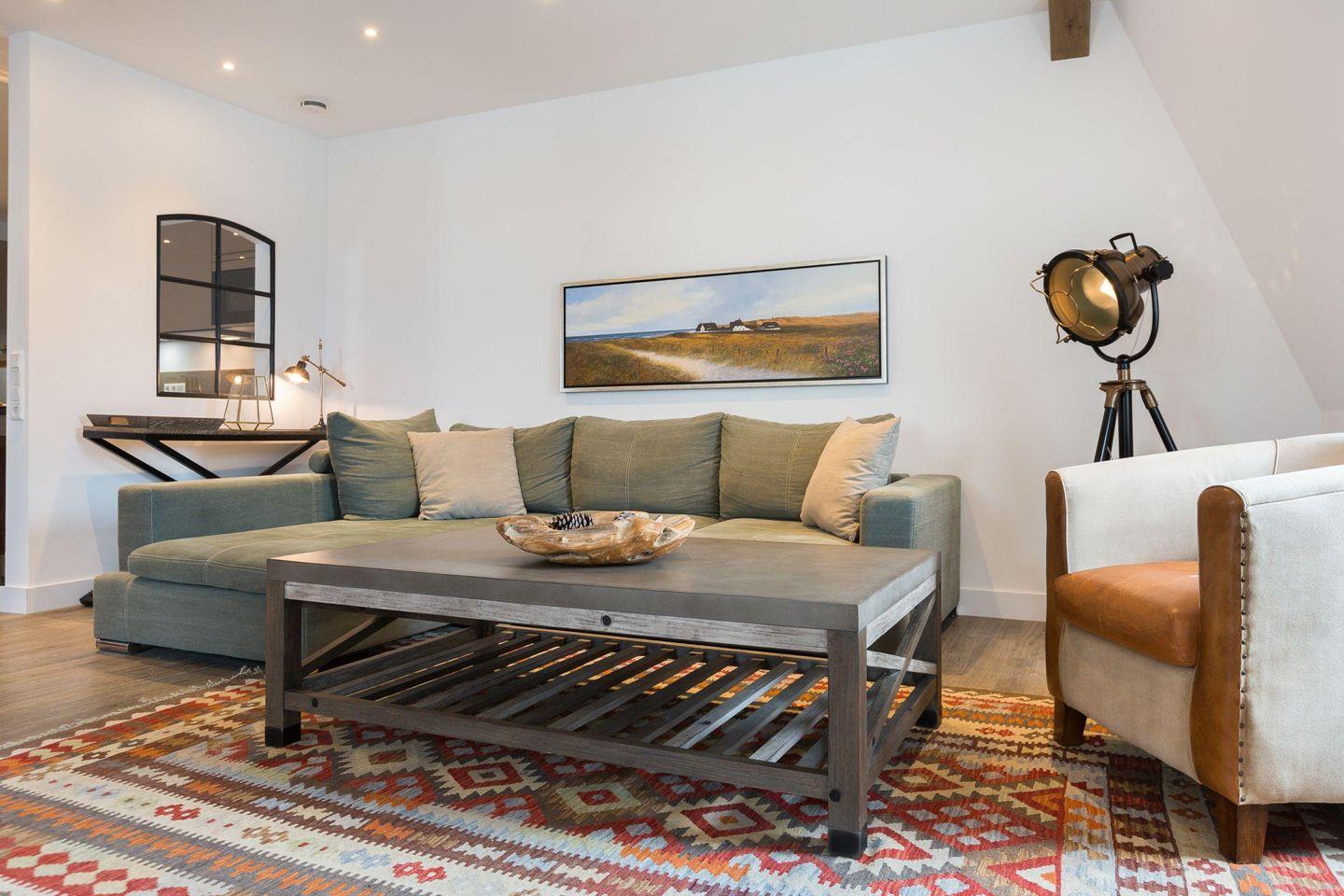 Exklusive 3-Zimmer-Ferienwohnung in Westerland, nur 150 m vom Strand, mit Wellnessbereich und stilvollem Retro-Design.