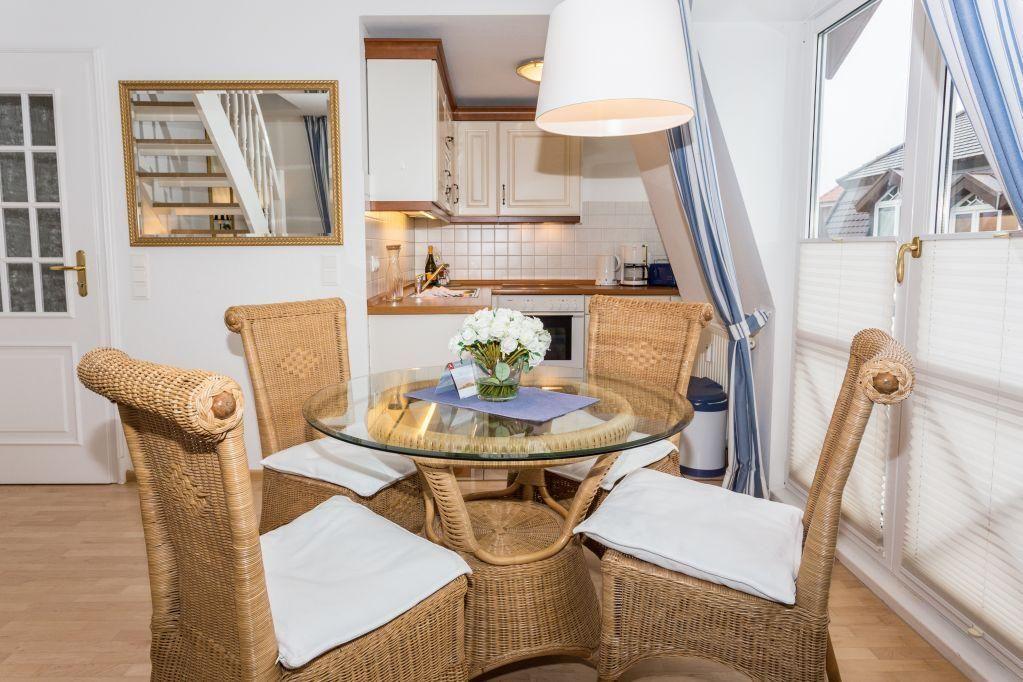 Das gemütliche Wohnzimmer ist mit einem Sofa, einem TV, einem Korbsessel und einem Esstisch für 4 Personen ausgestattet. Von hier aus haben Sie direkten Zugang zum sonnigen Westbalkon, wo Sie entspannte Stunden im Freien verbringen können.