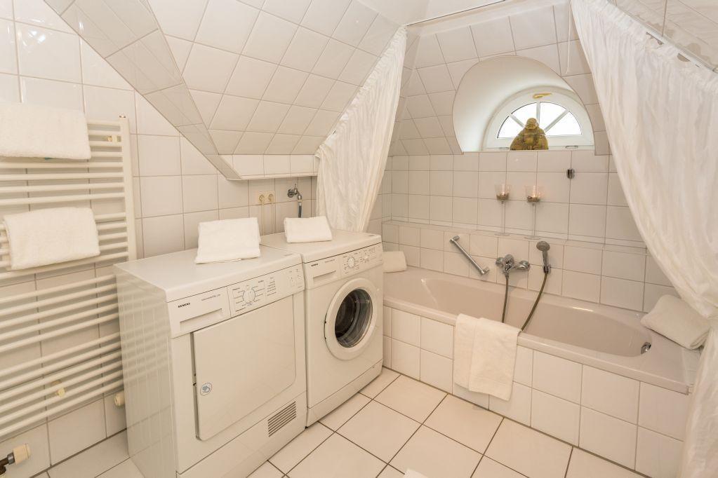 Das Badezimmer ist hell und modern gestaltet und bietet eine Badewanne mit integrierter Dusche, ein WC, einen Handtuchwärmer, einen Föhn und Tageslicht. Zusätzlich stehen eine Waschmaschine und ein Trockner für Ihre Wäsche zur Verfügung.