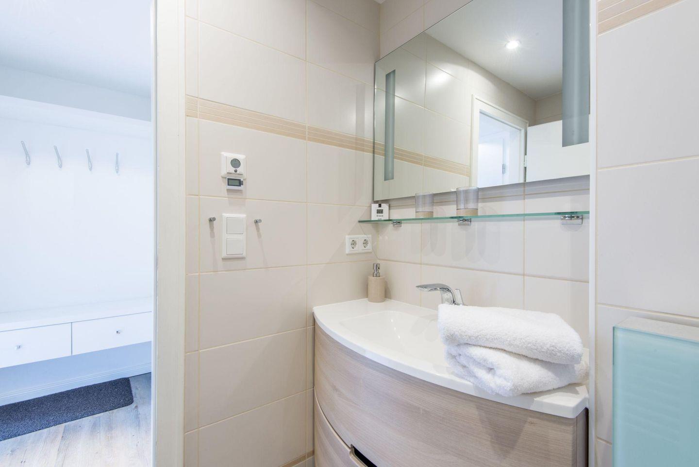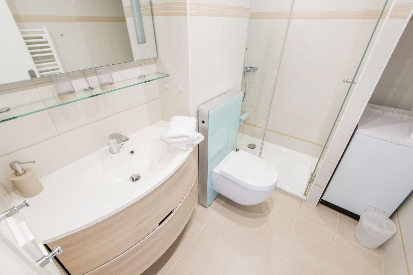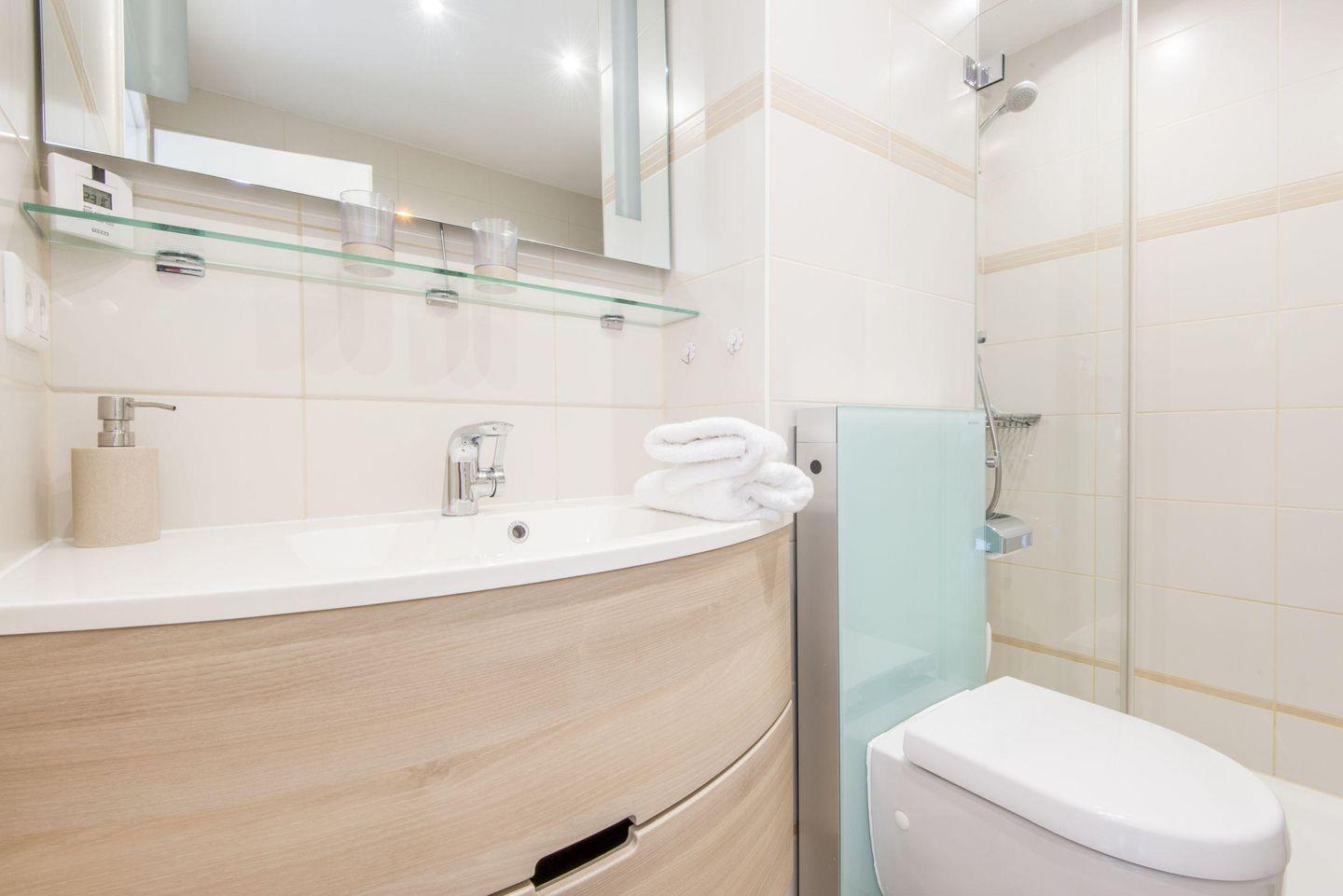 Das elegante Badezimmer ist mit einer geräumigen Dusche und WC ausgestattet.