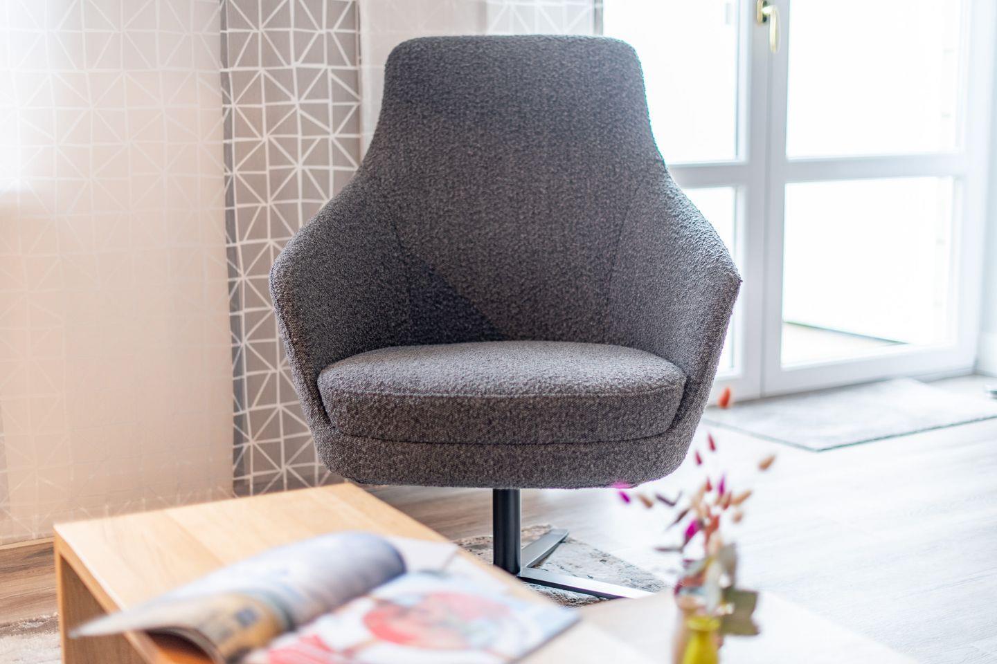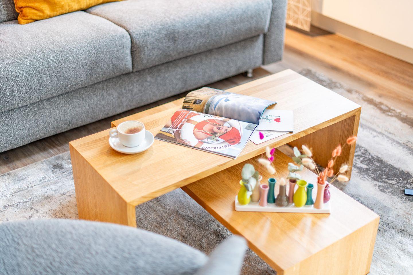 Der Wohnbereich ist ausgestattet mit einer ausziehbaren Schlafcouch (140x200 cm), Sesseln und einem Esstisch für 4 Personen. Ein direkter Zugang zur großen Dachterrasse nach Süd-Osten lädt zum Genießen der Sonne ein – die Terrasse ist möbliert und bietet schöne Ausblicke.