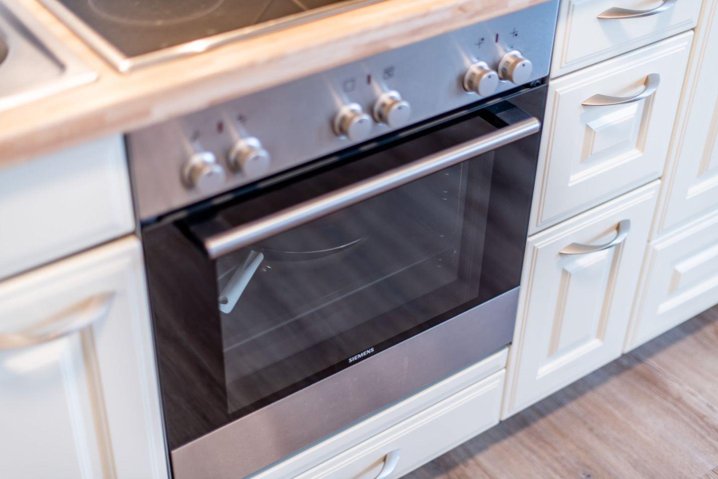 Die moderne offene Küche verfügt über einen 4-flammigen Herd, Geschirrspüler und Filterkaffeemaschine – ideal für entspannte Kochabende.