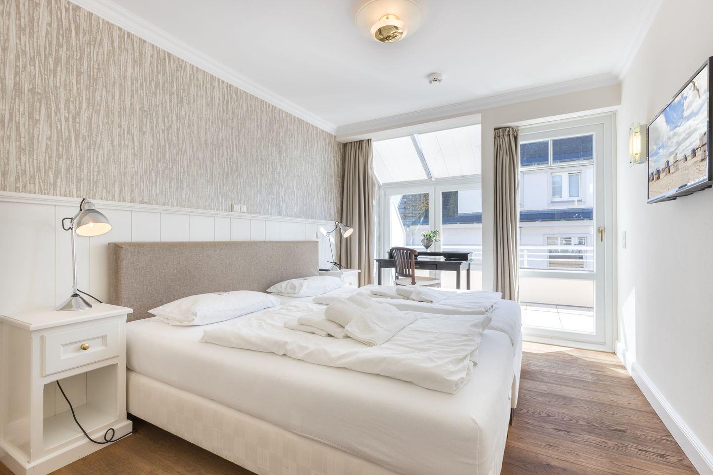 Das Schlafzimmer bietet ein komfortables Doppelbett (2x 90x200 cm), einen Schreibtisch, TV und Zugang zur Terrasse. Der angrenzende begehbare Kleiderschrank ist mit einem Safe ausgestattet.