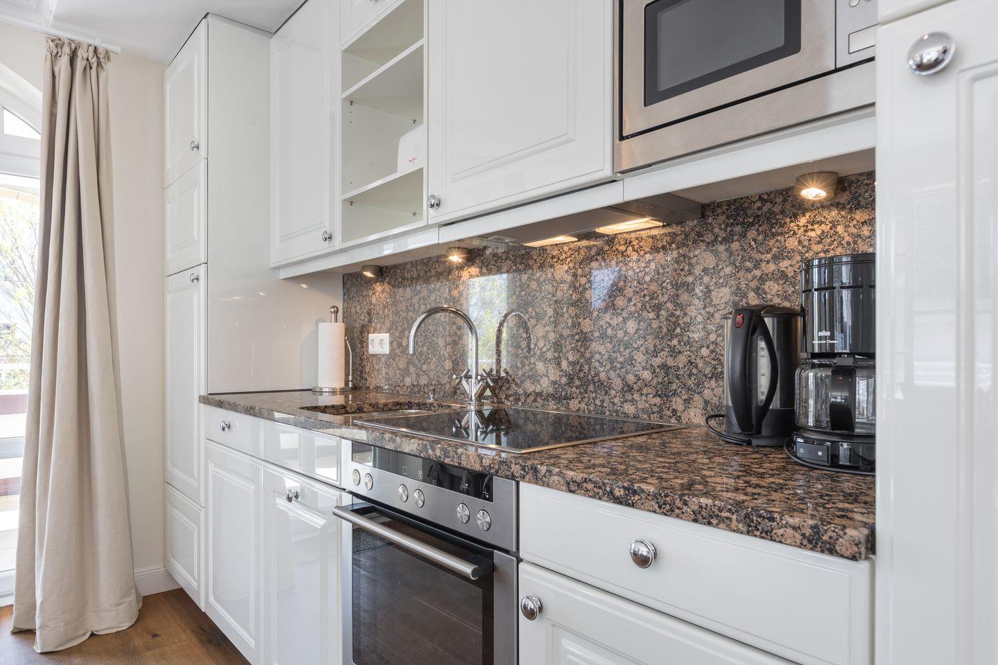 Moderne, offene Küche mit Backofen, Herd, Geschirrspüler und allem Komfort.