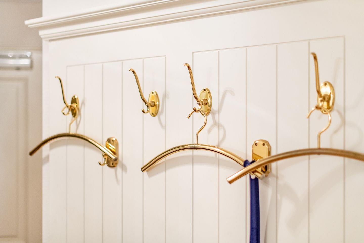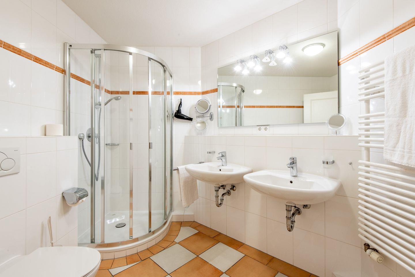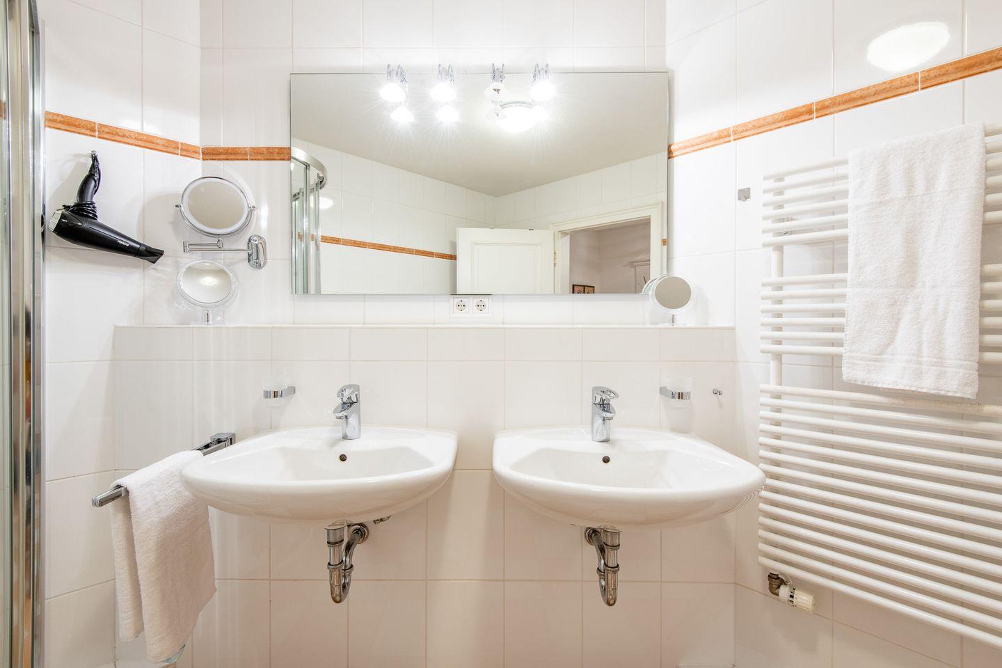 Das stilvolle Badezimmer ist mit einer Dusche, zwei Waschbecken, WC, Handtuchwärmer und Föhn ausgestattet.