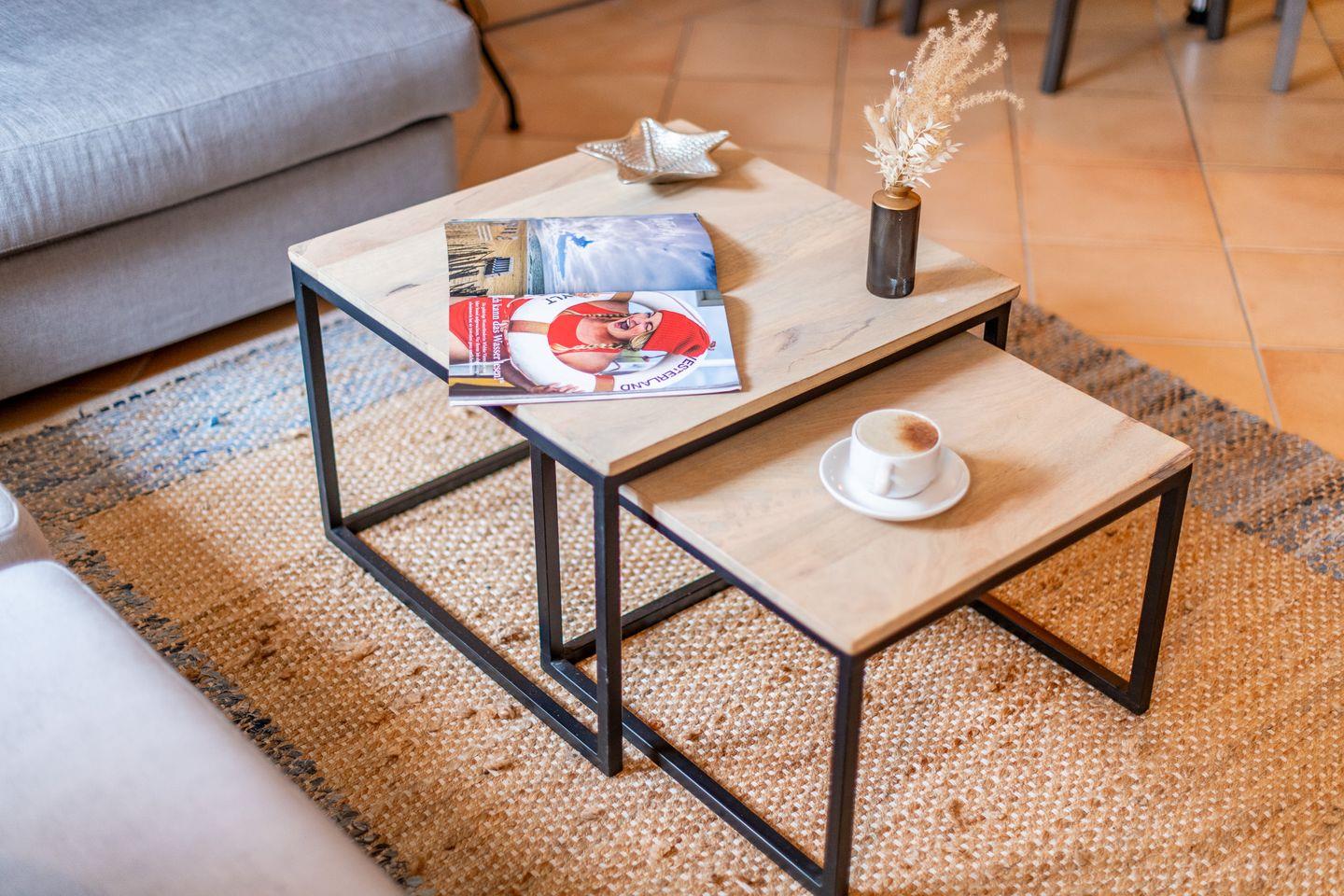 Das lichtdurchflutete Wohnzimmer ist mit einem komfortablen Sofa, einem Esstisch für 3 Personen und einem TV ausgestattet. Der direkte Zugang zum möblierten West-Balkon bietet eine sonnige Lage und gemütliche Abendstunden.