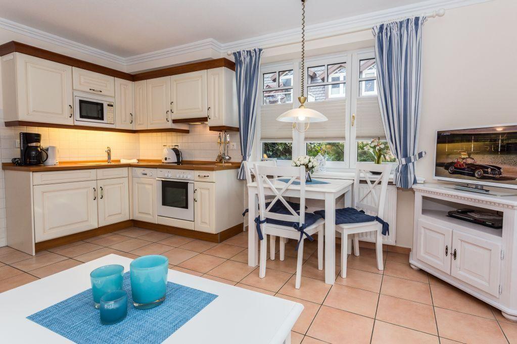 Das gemütliche Wohnzimmer ist mit einem ausziehbaren Schlafsofa (160x190 cm), einem Sessel und einem TV ausgestattet. Ein Esstisch für bis zu 3 Personen steht ebenfalls bereit. Vom Wohnzimmer aus haben Sie direkten Zugang zur möblierten Südterrasse mit Strandkorb und einem offenen Garten – perfekt, um die Sonne zu genießen.