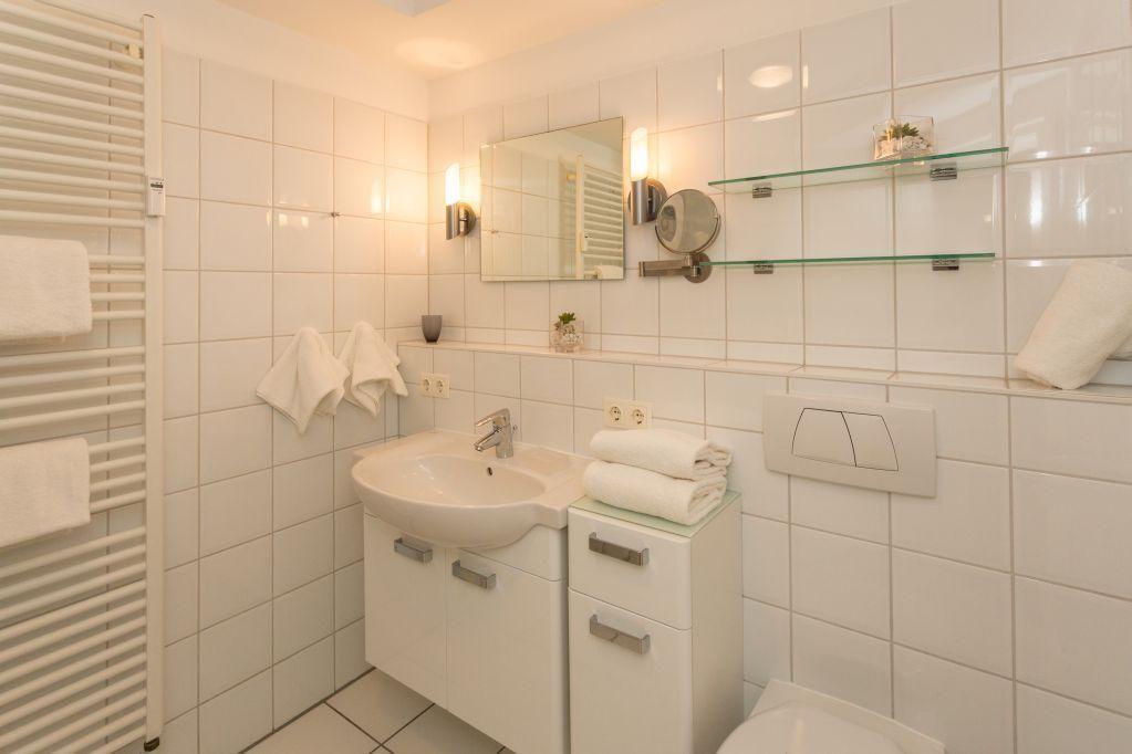 Das Badezimmer ist hell und modern gestaltet und verfügt über eine Dusche, ein WC, einen Handtuchwärmer und einen Föhn.