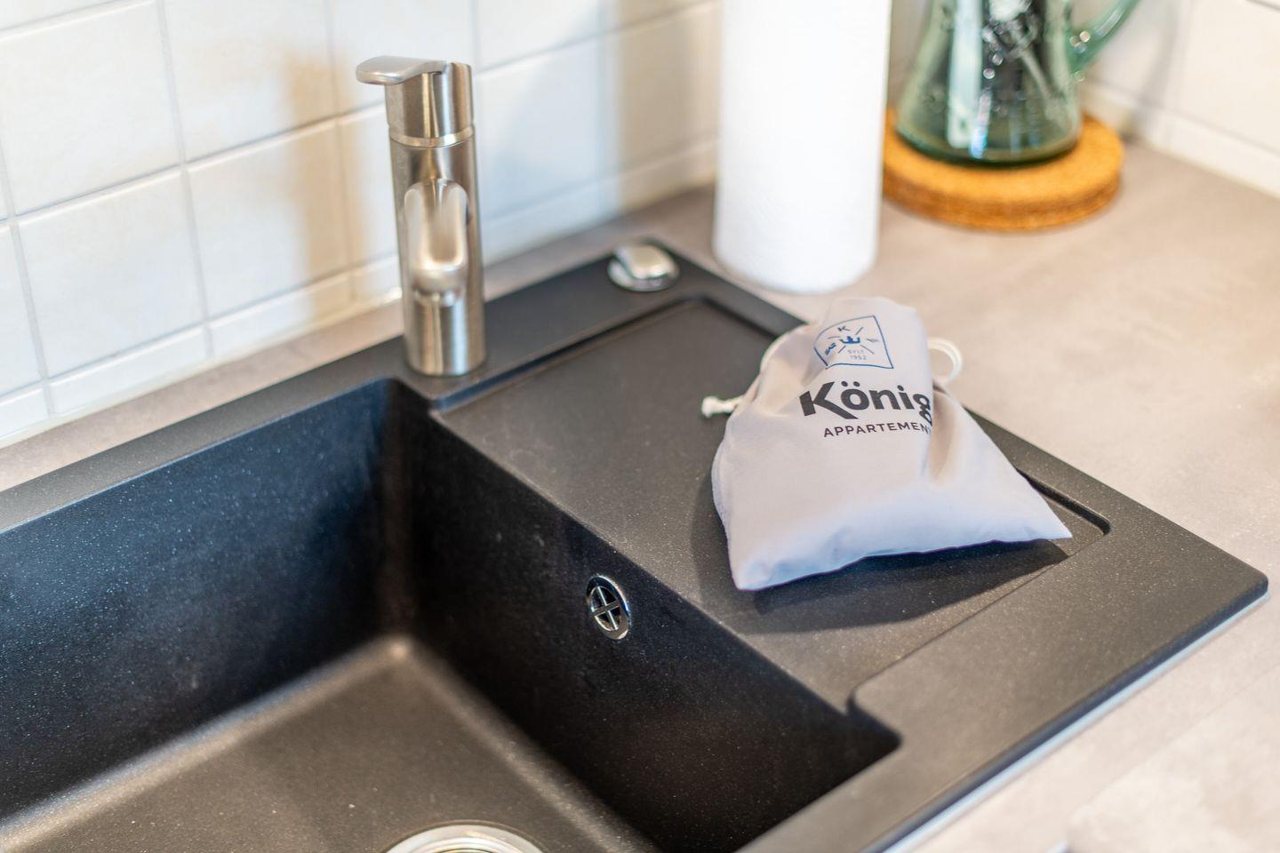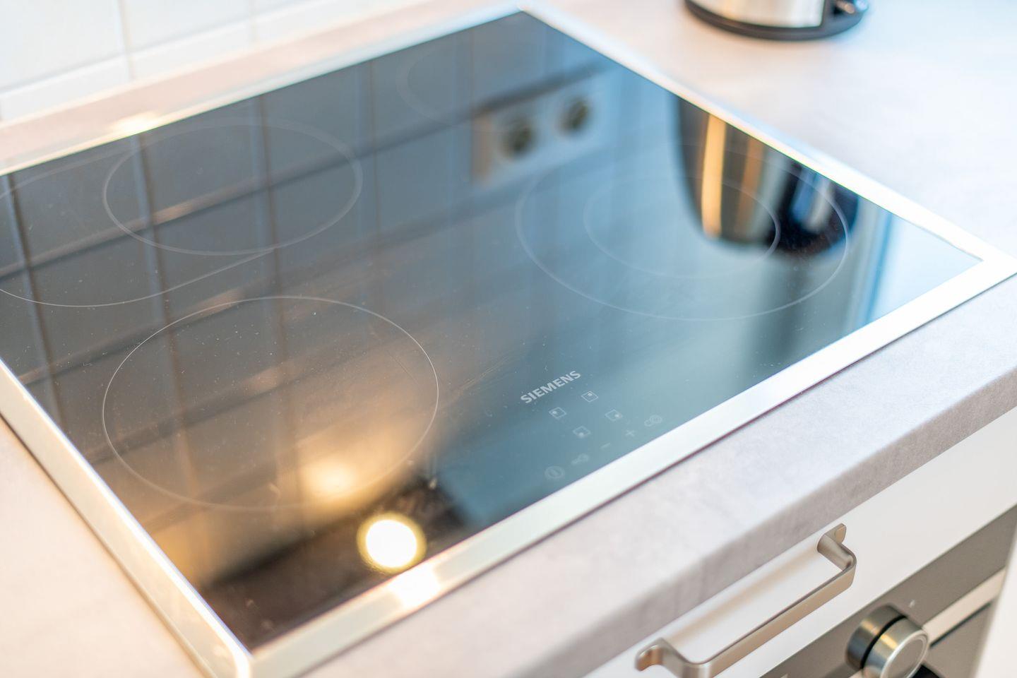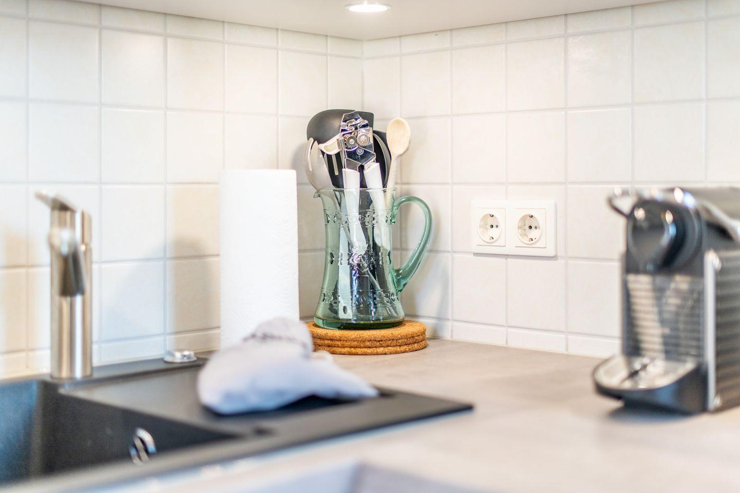 Die moderne offene Küche ist vollständig ausgestattet und bietet alle Annehmlichkeiten, darunter ein Cerankochfeld, einen Backofen, eine Filterkaffeemaschine und eine Nespresso-Maschine. Hier können Sie bequem Ihre Mahlzeiten zubereiten und genießen.