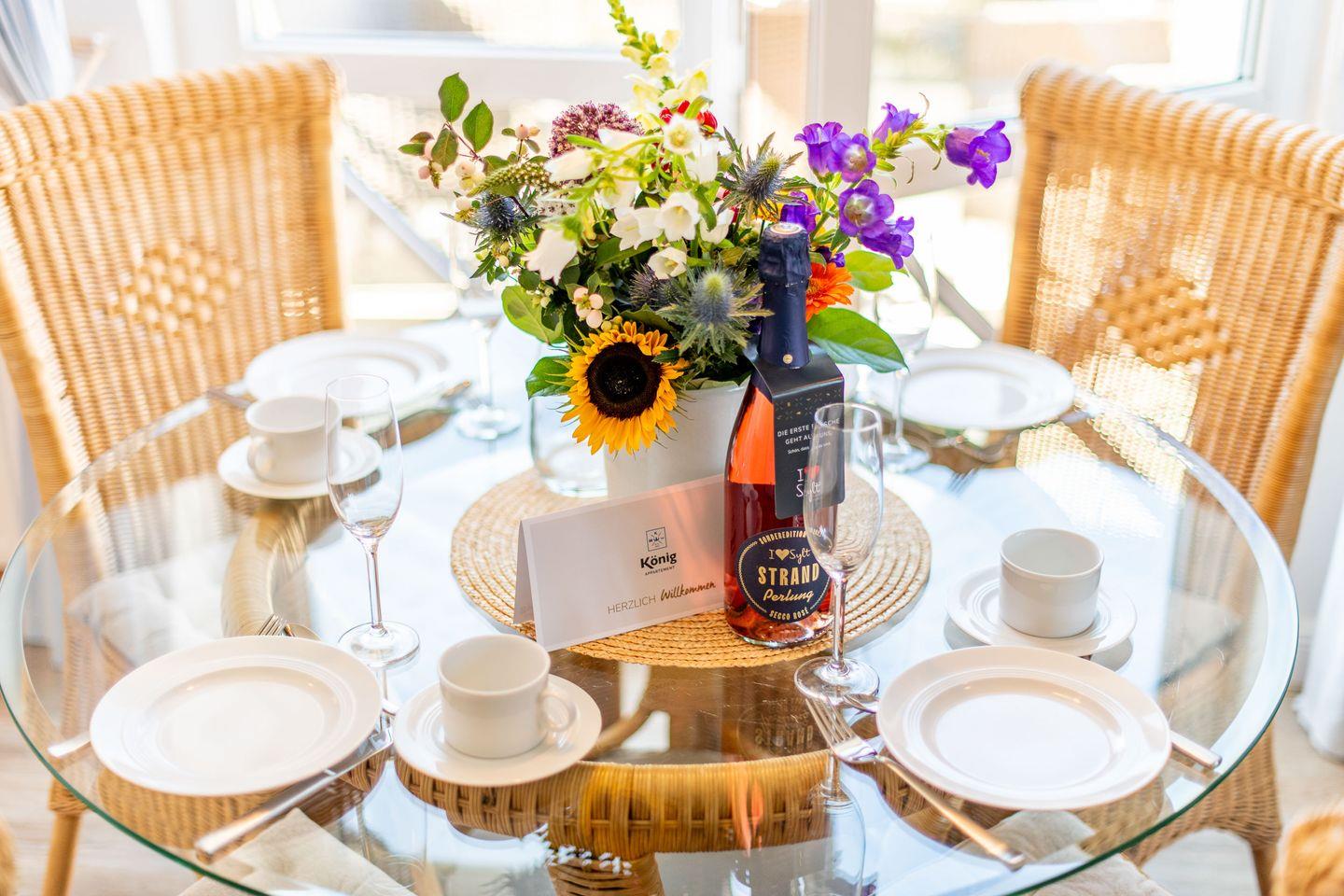 Das helle Wohnzimmer ist mit einem gemütlichen Sofa, einem Sessel und einem TV ausgestattet. Ein runder Esstisch bietet Platz für bis zu 4 Personen, ideal für gemeinsame Mahlzeiten. Der direkte Zugang zum möblierten Westbalkon lädt dazu ein, die Sonne und die frische Meeresluft zu genießen.