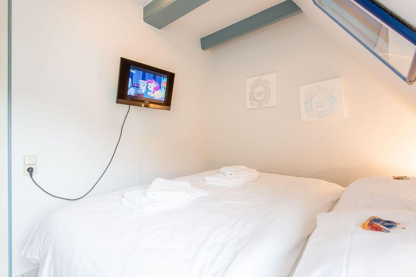 Das Schlafzimmer ist mit einem Doppelbett (2x 90x200 cm), einem TV und einem Kleiderschrank für ausreichend Stauraum ausgestattet.