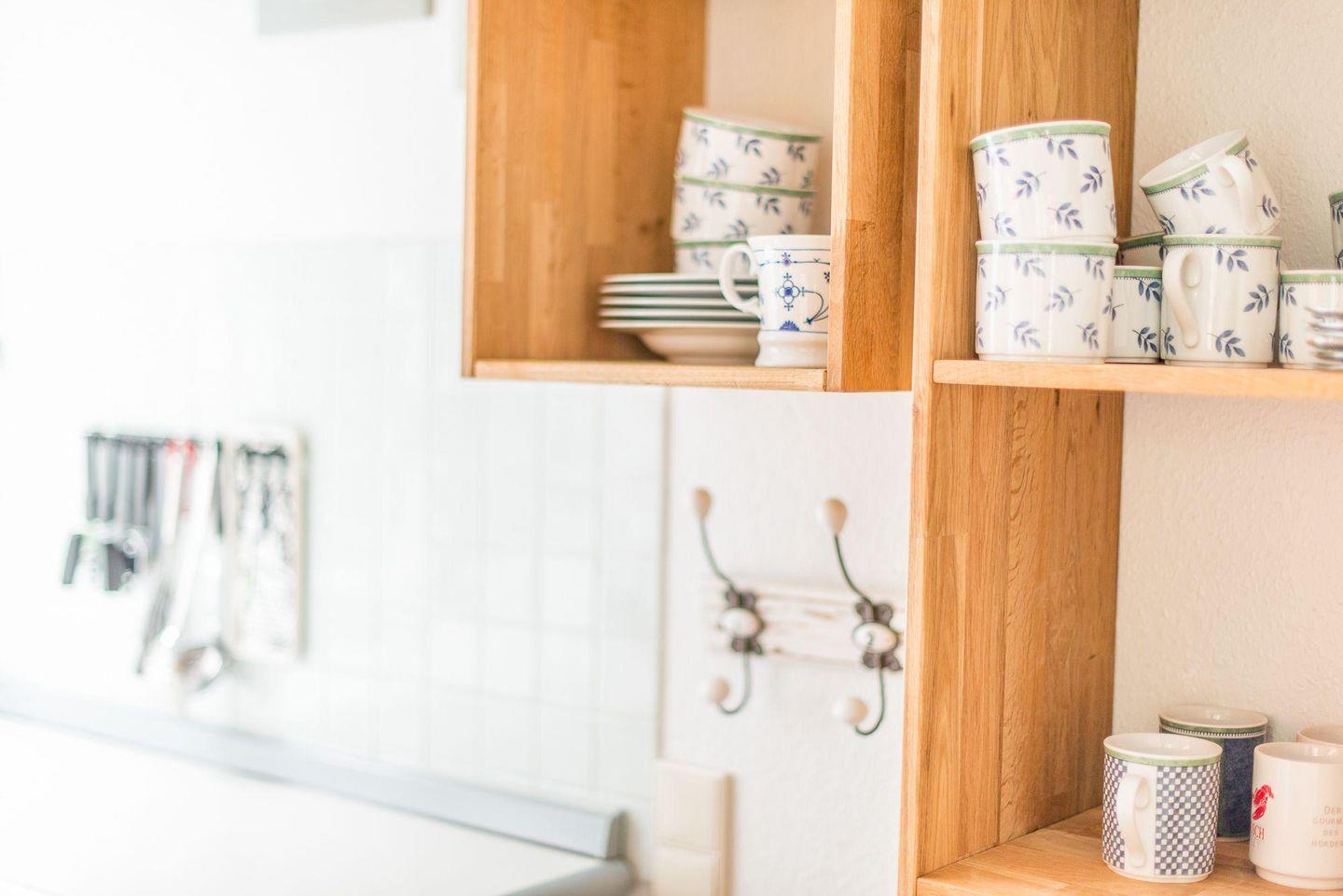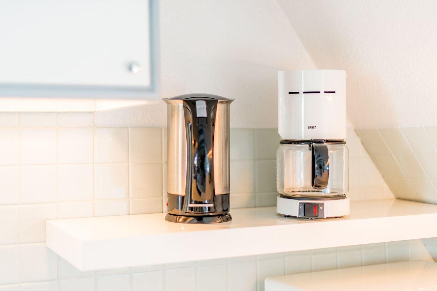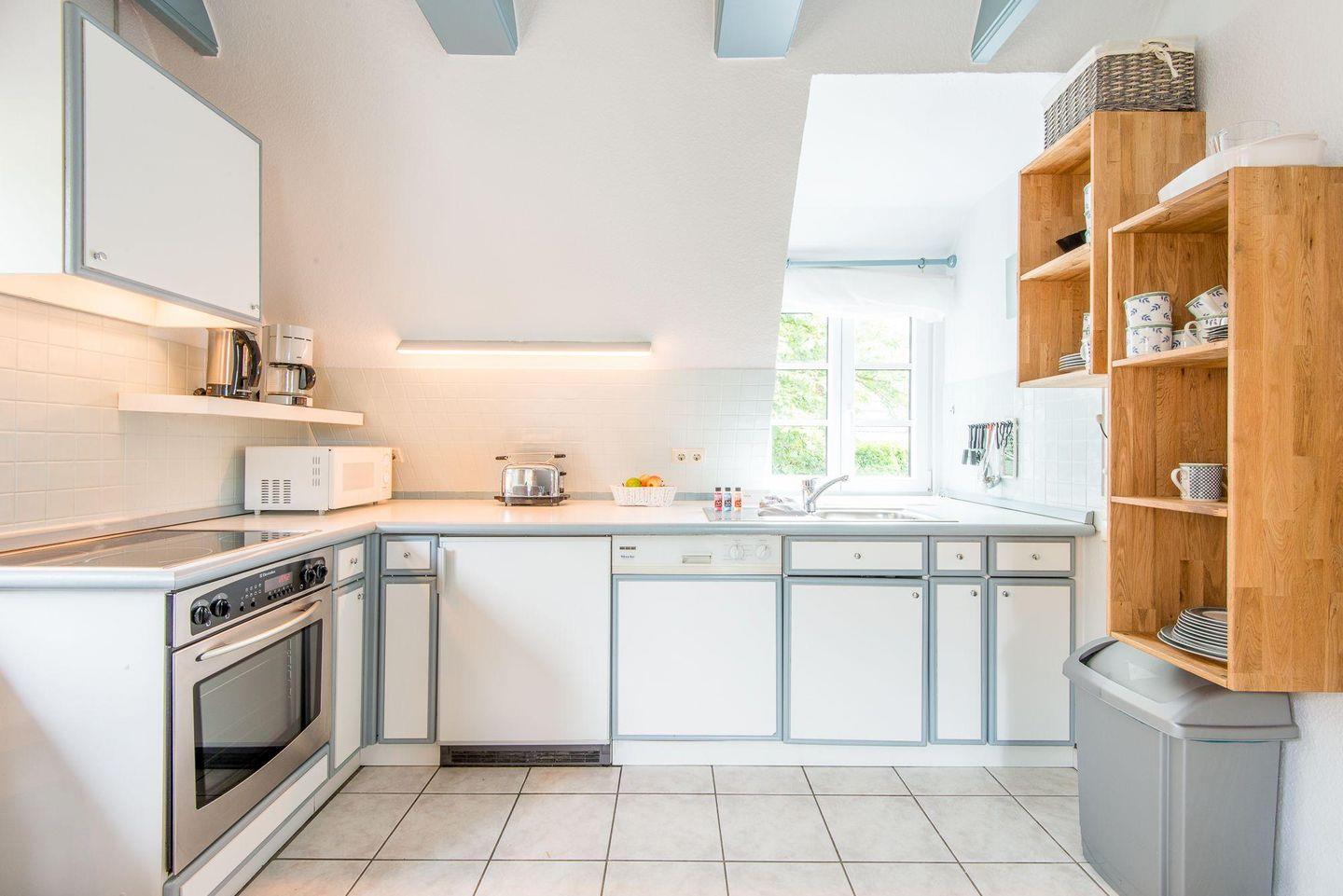 Die offene Küche ist komplett ausgestattet und bietet modernen Komfort, einschließlich Cerankochfeld, Geschirrspüler und Filterkaffeemaschine.