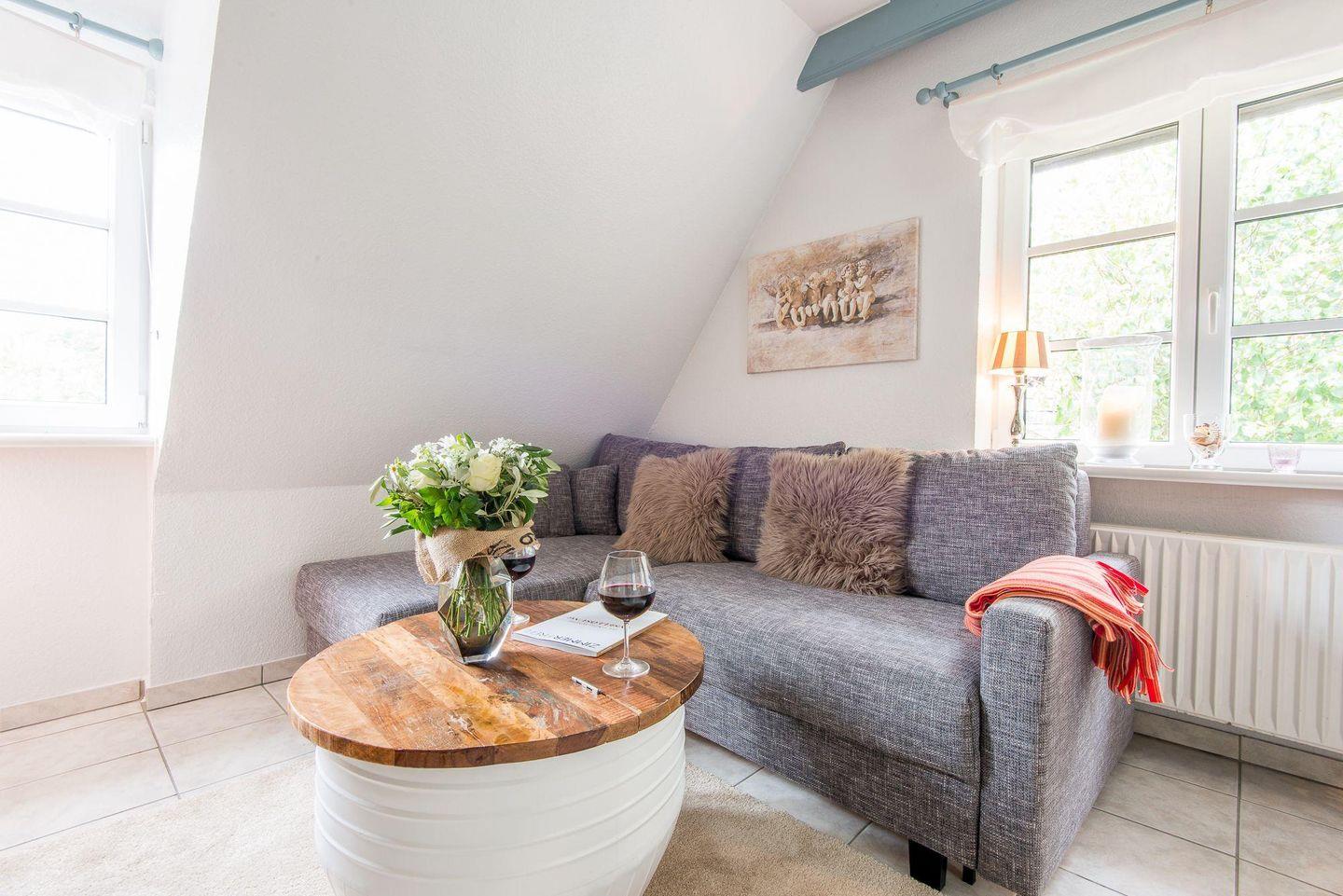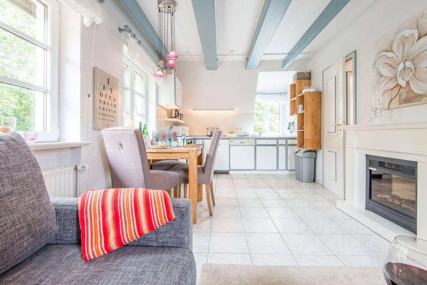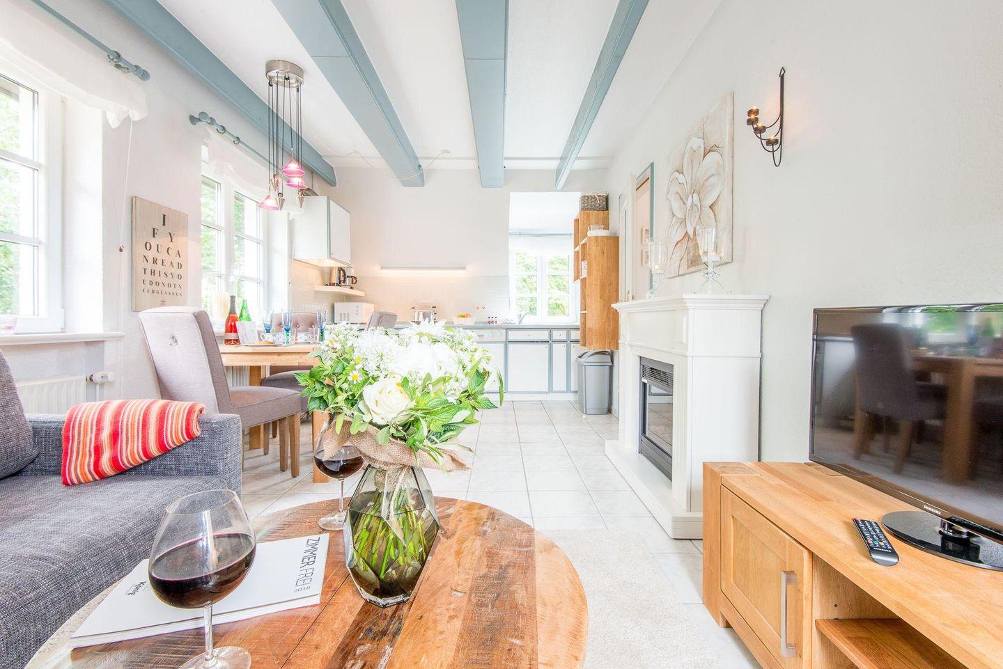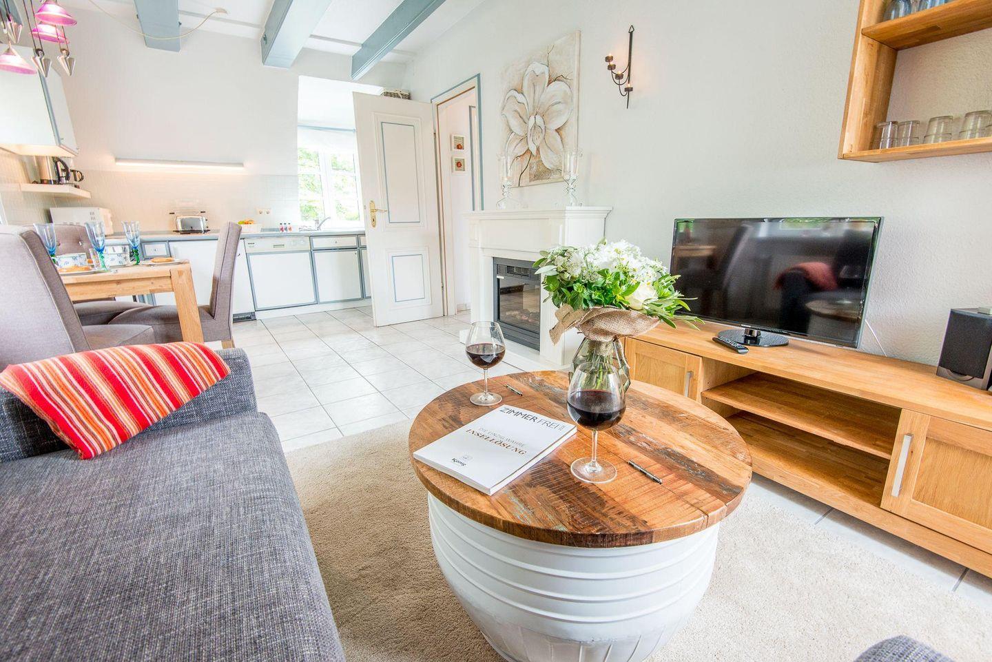 Der lichtdurchflutete Wohnbereich ist mit einem gemütlichen Sofa, einem Esstisch mit 3 Stühlen und einem TV ausgestattet. Vor dem Haus lädt der Sonnenfreisitz mit einem Strandkorb zum Entspannen und Genießen der frischen Seeluft ein.
